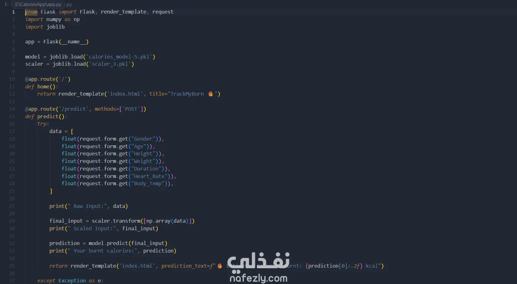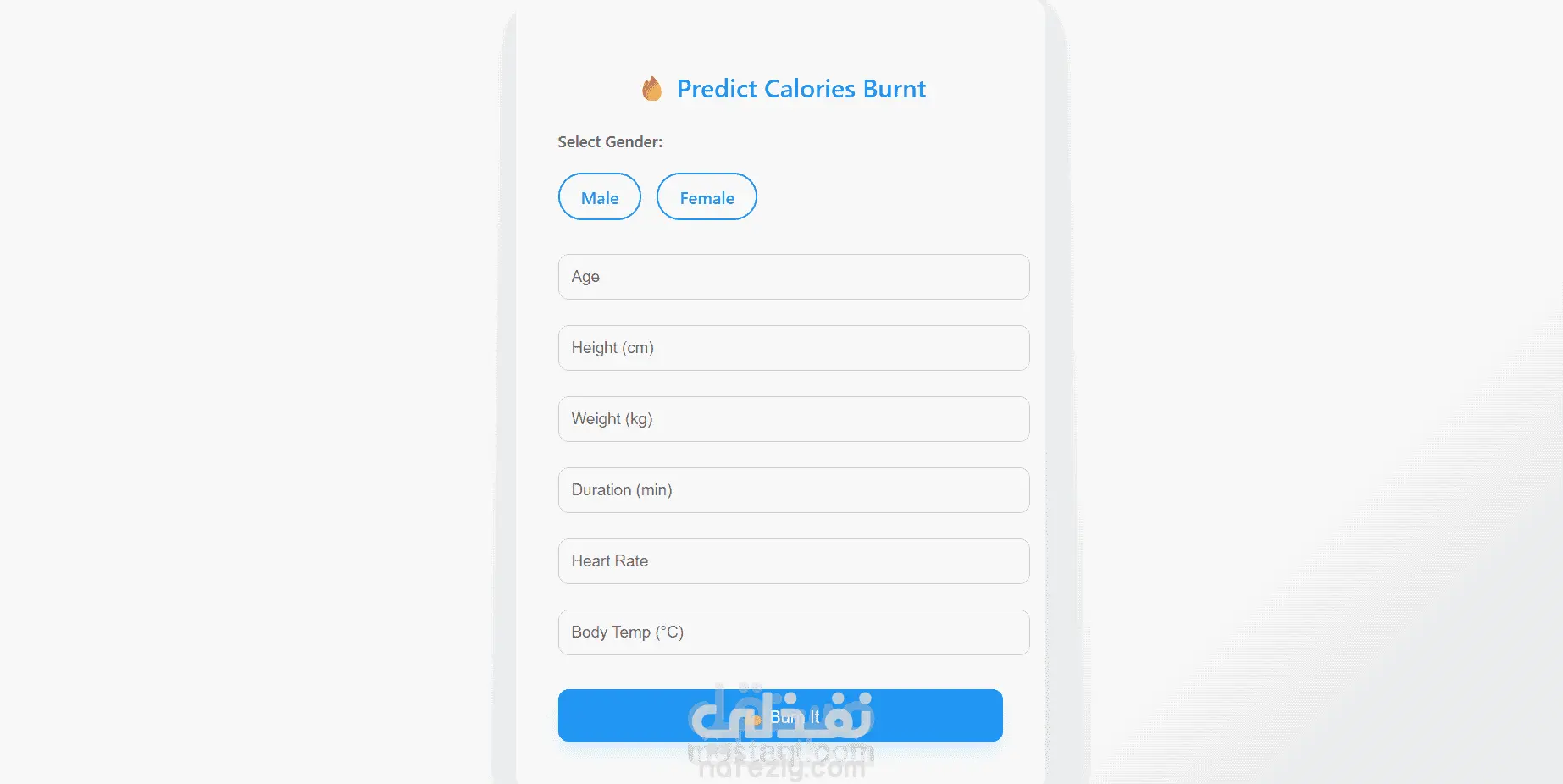 Predict Calories Burnt باستخدام Machine Learning مشروع موقع ويب يقوم بتوقّع عدد السعرات الحرارية المحروقة أثناء التمارين الرياضية . يقوم المستخدم بإدخال بياناته (العمر، الوزن، الطول، مدة التمرين، معدل ضربات القلب، درجة حرارة الجسم، والجنس)، ليتم عرض نتيجة التوقع بشكل فوري من خلال واجهة استخدام بسيطة وسهلة.