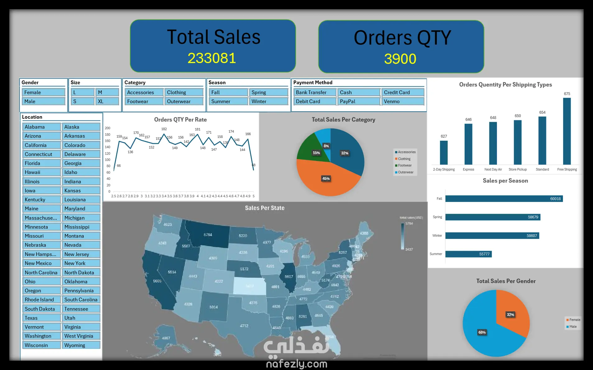 تنظيف بيانات المتجر , ثم عمل لوحة بيانات علي برنامج excel تصف المبيعات لمتجر ملابس حسب (الفئة - الموسم - طريقة الدفع - المقاس - جنس العميل) و كمية القطع المباعة في جميع انحاء الولايات المتحدة