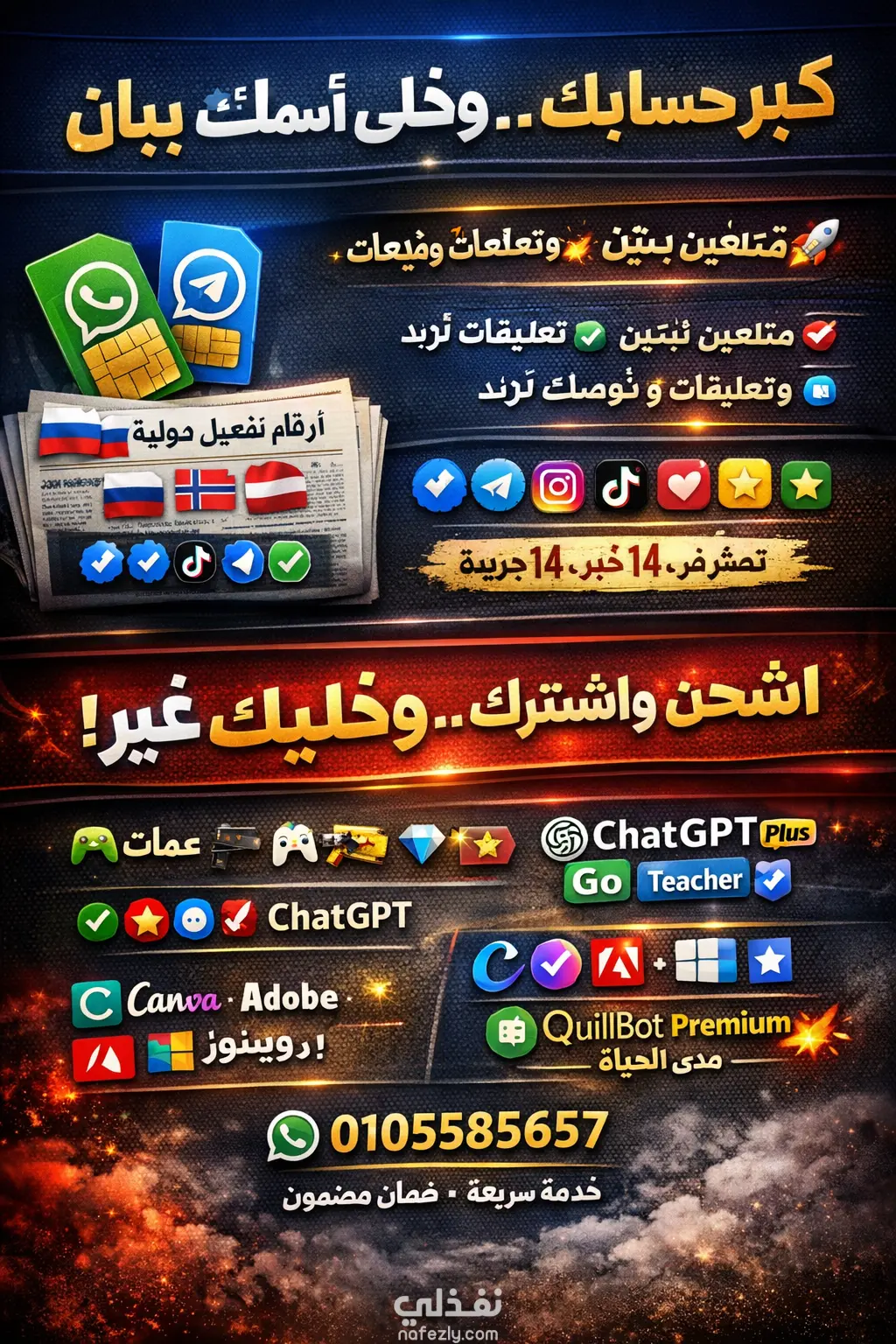 مبرمج و خبير سوشيال ميديا مبرمج مستجد في سوق البرمجه لاكن بعقلية مبرمج متخصص 10 سنوات . خبير خدمات سوشيال ميديا و بيع حسابات و اشتراكات Premium متوفر تزويد جميع منصات السوشيال ميديا متابعين • لايكات • تعليقات • مشاهدة . كل هذا و اكثر 😎👌🏻🔥