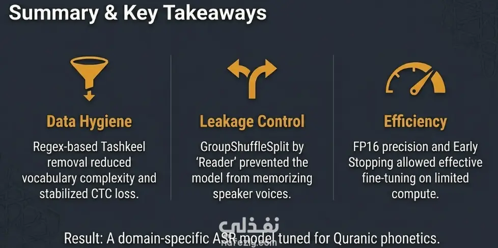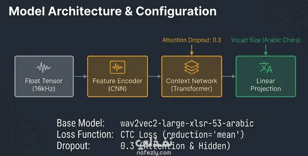 يتمثل هذا المشروع في ضبط دقيق لنموذج Wav2Vec2 (تحديداً النسخة "wav2vec2-large-xlsr-53-arabic") المتخصص في التعرف الآلي على الكلام (ASR) للقرآن الكريم باللغة العربية. يهدف العمل إلى بناء نظام ذكاء اصطناعي قادر على تحويل التلاوات الصوتية إلى نصوص مكتوبة بدقة عالية عبر تدريب النموذج على بيانات قرآنية موثقة. ميزات العمل: • التعميم عبر القراء: يتم تقسيم البيانات باستخدام تقنية GroupShuffleSplit بناءً على هوية القارئ، وهذا يضمن اختبار النموذج على أصوات قراء لم يسمعهم أبداً أثناء التدريب، مما يعزز من قدرته على العمل مع مختلف الأصوات • المعالجة الصوتية القياسية: تحويل كافة الملفات الصوتية إلى تردد 16 كيلو هرتز (Resampling) لضمان توافقها التام مع متطلبات النموذج العالمي. • المعالجة المسبقة (Preprocessing): استخدام Wav2Vec2Processor لتحويل الموجات الصوتية إلى قيم رقمية وتشفير النصوص المقابلة لها مع معالجة الحشو (Padding) لتوحيد أطوال المدخلات. عملية التدريب: استخدام نظام Trainer من مكتبة Hugging Face لتنفيذ التدريب على مدار 20 دورة (epochs)، مع مراقبة معدل خطأ الكلمات (WER) كمعيار أساسي للجودة .