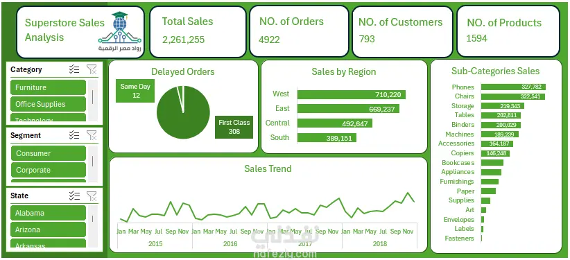 قرير فحص وتحليل مبيعات المتجر (Superstore) الهدف من التحليل: فحص بيانات المبيعات على مدار 4 سنوات (2015-2018) للكشف عن أنماط النمو وتشخيص العقبات التشغيلية في عمليات الشحن. النتائج الجوهرية (أهم ما كشفه التحليل) عقدة العمليات اللوجستية: تبين من الفحص أن فئة الشحن "First Class" هي المتسبب الأكبر في التأخير، بإجمالي 308 حالة تأخير، مقارنة بـ 12 حالة فقط في الشحن "في نفس اليوم". هذا يتطلب إعادة تقييم عاجلة لسلسلة التوريد لهذه الفئة. المناطق الأكثر ربحية: تتصدر المنطقة الغربية (West Region) المشهد كأقوى سوق للمتجر، بمساهمة قدرها 710,220 دولار من إجمالي الإيرادات. أداء المنتجات: تحقق الهواتف والكراسي أعلى معدلات دخل، بينما تظهر "المثبتات والملصقات" (Fasteners & Labels) كأقل المنتجات طلباً في السوق. تحليل الاتجاهات: تظهر المبيعات نمطاً موسمياً دورياً، حيث تبلغ ذروتها دائماً في الربع الأخير من كل عام (Q4)، مما يشير إلى طلب مرتفع جداً في مواسم الأعياد. المنهجية التقنية (أدوات التحقيق) تنظيف البيانات (Data Cleaning): معالجة القيم المفقودة، إزالة التكرارات، وتوحيد صيغ التواريخ لضمان دقة التحليل الزمني. نمذجة البيانات: ربط الفئات والمنطق الجغرافية والفترات الزمنية لبناء رؤية شاملة. التحليل الإحصائي: حساب مؤشرات الأداء الرئيسية (KPIs) لصافي المبيعات (2.26 مليون دولار)، وقاعدة العملاء (793 عميل)، وحجم الطلبات (4,922 طلب). تصميم لوحة البيانات (Dashboard): بناء واجهة تفاعلية تسمح بالتعمق في التفاصيل حسب الولاية، الفئة، أو قطاع المستهلكين. التوصيات الاستراتيجية إجراء فوري: التحقيق في أداء شريك الشحن الخاص بفئة "First Class" لسد فجوة التأخير (308 طلب). إدارة المخزون: زيادة مخزون "الهواتف والكراسي" قبل بداية الربع الأخير من العام لاستغلال طفرة المبيعات الموسمية. توسع تسويقي: دراسة أسباب انخفاض المبيعات في "المنطقة الجنوبية" (389 ألف دولار) لاكتشاف الفرص غير المستغلة.