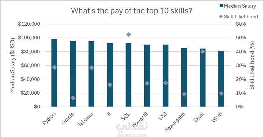 النتيجة: المهارات البرمجية والهندسية (Oracle, Python) تتصدر القائمة، بينما تقع المهارات المكتبية التقليدية في ذيل القائمة من حيث القيمة المالية.