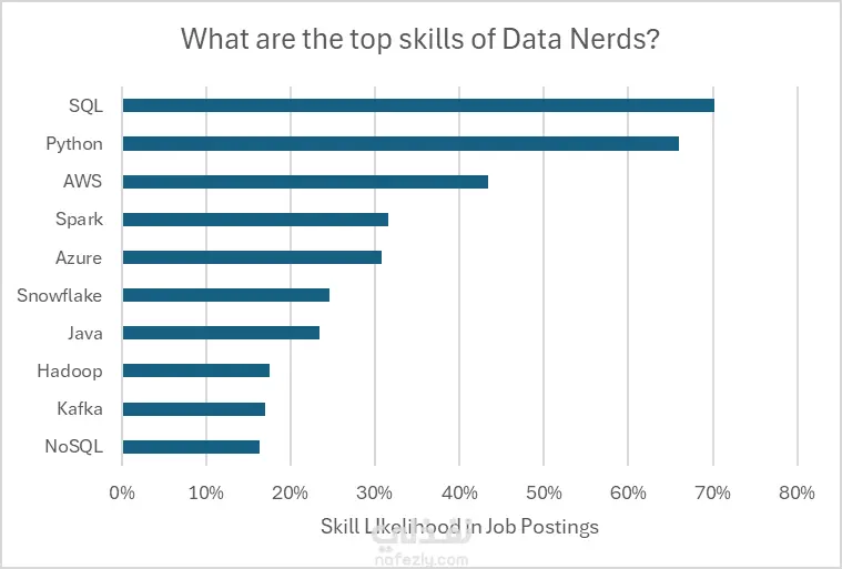 التحليل: فرضت لغات SQL و Python سيطرة كاملة كأكثر المهارات طلباً، تليها مهارات الحوسبة السحابية مثل AWS و Azure.