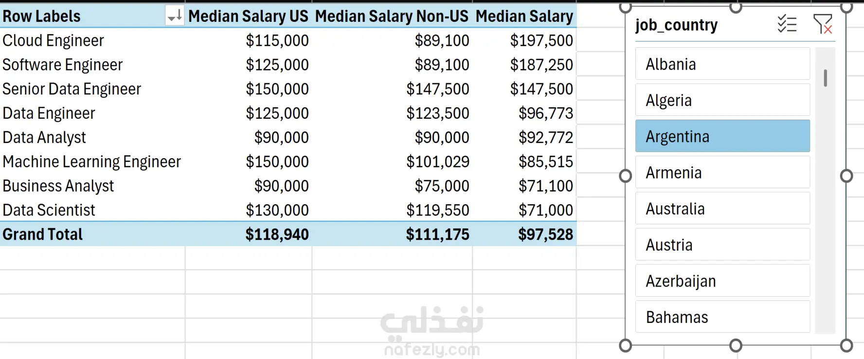 التحليل: باستخدام مقاييس DAX، تبين وجود فجوة سعرية لصالح السوق الأمريكي خاصة في أدوار "عالم البيانات"، مما يعكس تركز الاستثمار التقني هناك.