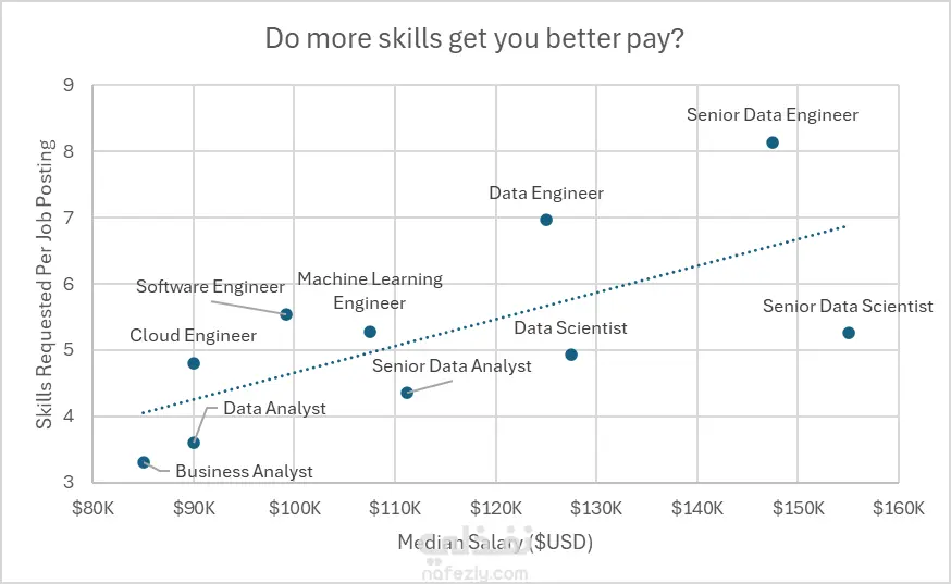 التحليل: أظهرت البيانات علاقة طردية قوية؛ حيث تتطلب الوظائف القيادية مثل (Senior Data Engineer) حزمة مهارات واسعة مقابل رواتب مرتفعة جداً.