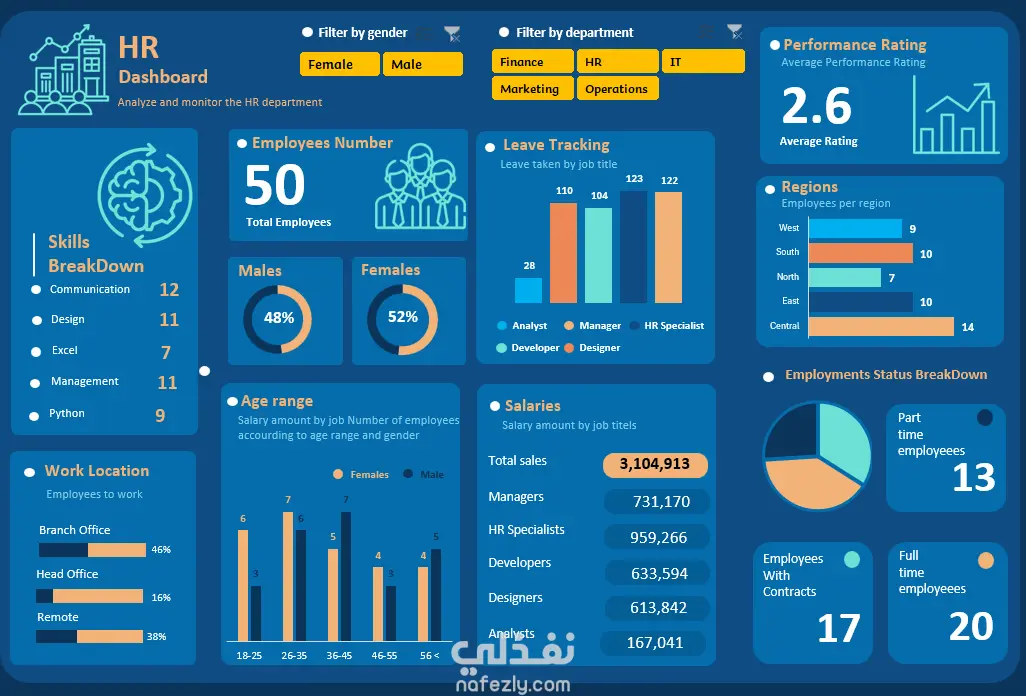 تم تطوير لوحة تحكم تفاعلية لمتابعة بيانات الموارد البشرية باستخدام Microsoft Excel و Power BI. تتيح اللوحة عرض وتحليل مؤشرات الأداء الرئيسية (KPIs) مثل: عدد الموظفين حسب القسم والوضع الوظيفي نسب الحضور والغياب تقييمات الأداء تتبع التوظيف والفصل توفر اللوحة واجهة تفاعلية تساعد فرق الإدارة على اتخاذ قرارات مبنية على البيانات، مع إمكانية التصفية حسب القسم أو الفترة الزمنية. تم التأكد من دقة البيانات وسلامتها لضمان موثوقية التحليلات