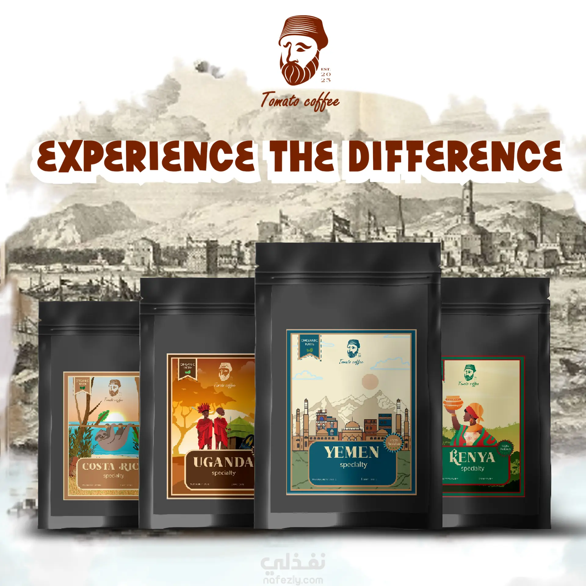 قمت بتصميم تغليف باكيج لمنتج قهوة يتميز بنكهات متعددة من كل دولة و قمت بابراز كل نكهة بطريقة تربطها بينها و بين الدولة التي مصدر البن منها لابراز هويتها و قمت باستخدام : Adobe Photoshop Adobe Illustrator