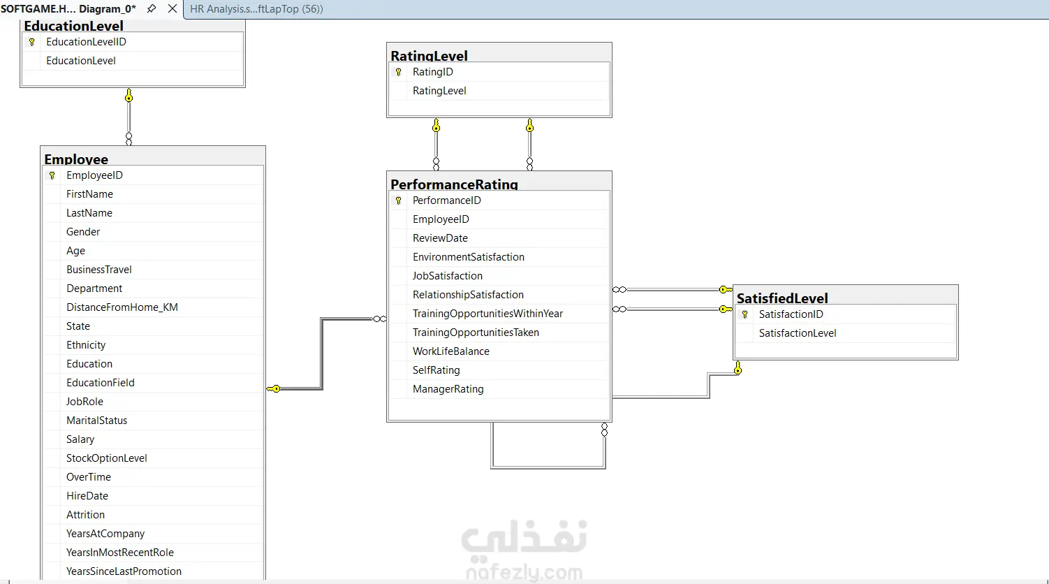 تحليل الموارد البشرية تقنياً: تصميم جداول خاصة لمستويات الرضا (Satisfied Level) وتقييمات الأداء (Performance Rating) لضمان تحليل دقيق لبيئة العمل.