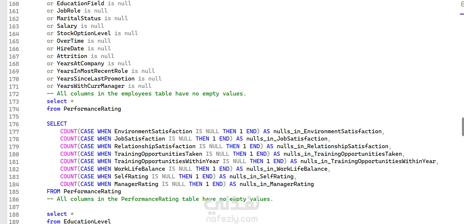 التحقق من جودة البيانات: كتابة استعلامات SQL متقدمة باستخدام (SELECT, CASE WHEN, COUNT) لفحص القيم المفقودة (Null Values) في كافة الأعمدة الحيوية مثل (Job Satisfaction, Work Life Balance, Salary).