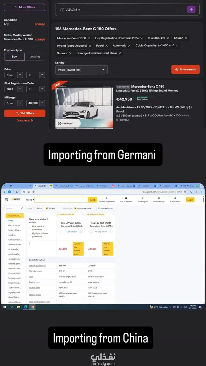 أقدم خدمة متكاملة في تحليل ودراسة أسواق السيارات العالمية (الأوروبية، الصينية، والإماراتية والكورية) لضمان اختيار أفضل المركبات المطابقة للمواصفات الفنية والقانونية. تضمن العمل في هذا المشروع: * تحليل السوق الألماني: البحث عبر منصات مثل Mobile.de للمواصفات الأوروبية. * دراسة السوق الصيني: رصد أحدث عروض السيارات الكهربائية (EVs). * تغطية سوق الإمارات: اختيار مركبات بمواصفات خليجية عبر منصات دبي بأسعار تنافسية. * السوق الكوري: متابعة عروض السيارات من المصادر الكورية لضمان الجودة والسعر. * مطابقة المواصفات والجمارك: التأكد من سنة الصنع، سعة المحرك، وكافة الشروط المطلوبة للاستيراد. * تقييم السعر: عمل مقارنات سعرية شاملة لضمان أعلى توفير مالي.