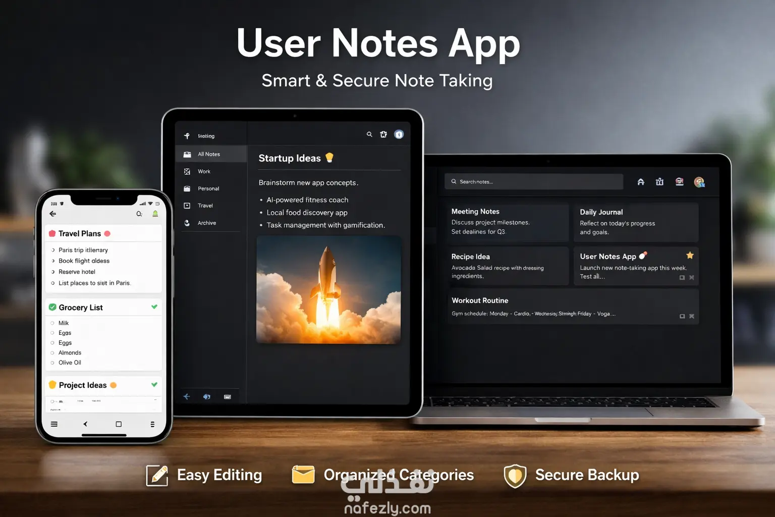 تطبيق User Notes App هو تطبيق ملاحظات ذكي وسهل الاستخدام، يتيح للمستخدمين كتابة وتنظيم وحفظ ملاحظاتهم اليومية بسرعة وأمان، مع واجهة استخدام بسيطة وتجربة سلسة.