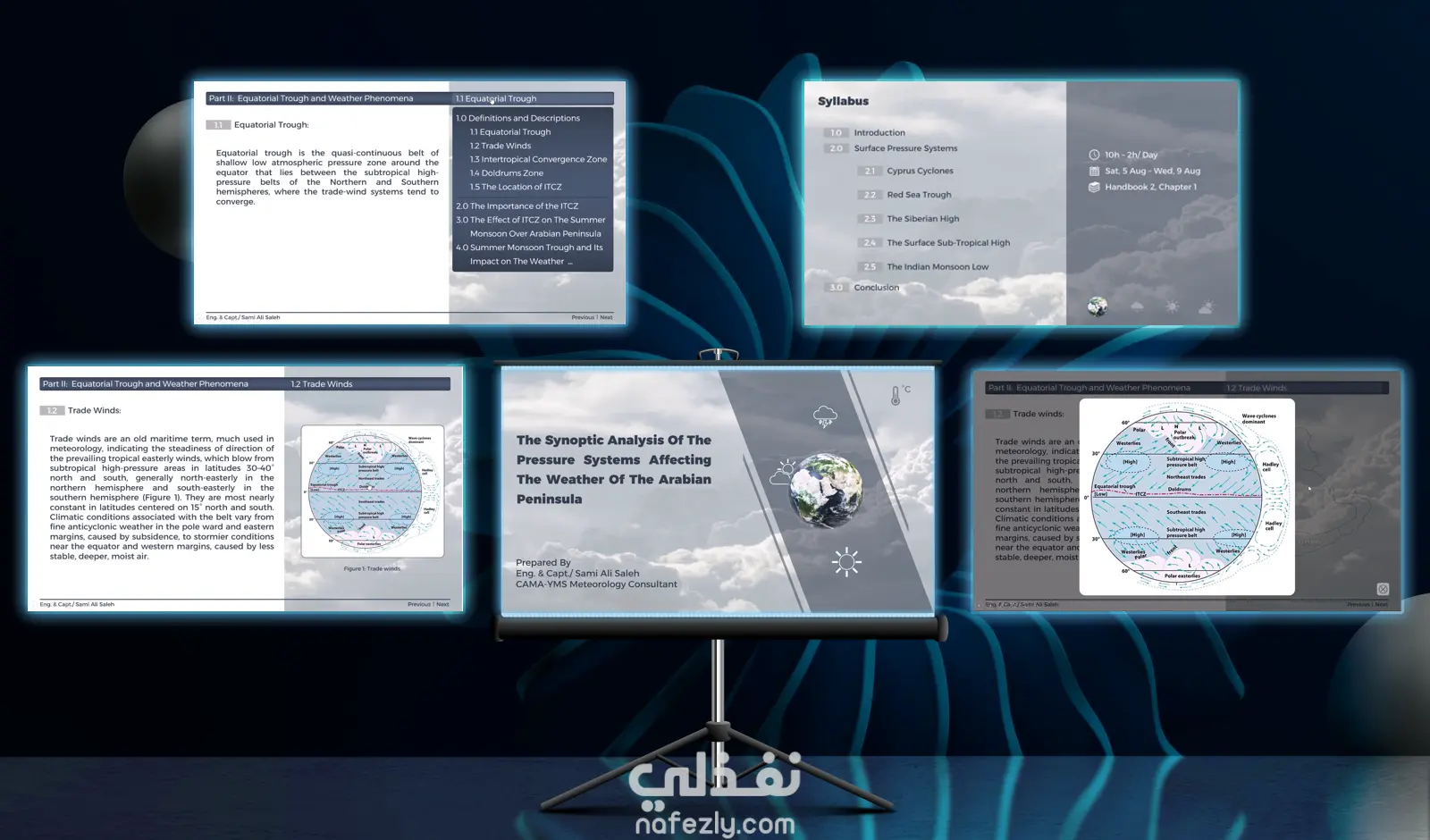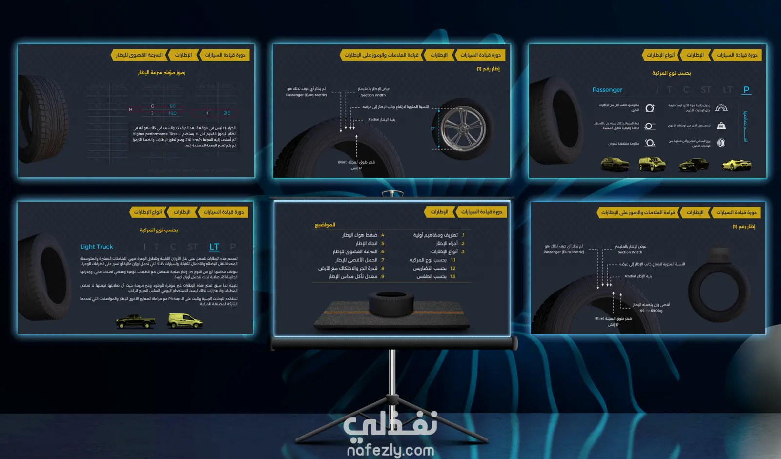 مرحباً، أعرض لكم نماذج أعمال لعروض تقديمية احترافية 3D، أتمنى أن تنال إعجابكم. هذه النماذج ترونها في صور مصغرة وفي فيديو يوتيوب لمشاهدة المؤثرات. العروض ثلاثية الأبعاد هي التي تحتوي على مجسمات 3D والتي تُستخدم لأغراض مختلفة، منها أن يكون المجسم هو موضوع العرض مثل المجسمات الطبية (مجسم قلب أو رئة ... إلخ) يُشرح عليها الموضع الطبي، او لغرض جمالي بحيث يعطي مظهر جمالي وإثارة في العرض. تحتاج عروض الـ 3D إلى دقة وخبرة في التعامل مع المجسمات خاصة في وضع المؤثرات الحركية. النماذج هي: ■ عرض تقديمي لعرض منتج تجاري - مفروشات، وقد استخدمت مجسم للمنتج بأقمشة مختلفة. ■ عرض تقديمي لدورة في قيادة السيارات، وهذا هو جزء عن الإطارات واستخدمت فيه نموذج لإطار كمظهر جمالي وفي شرح معلومات عن الإطارات. ■ عرض تقديمي لدورة تدريبية في مجال الأرصاد الجوية، استخدمت مجسم الكرة الأرضية لغرض جمالي، كما استخدمت قائمة منسدلة للتنقل بين محتويات مواضيع الدورة.