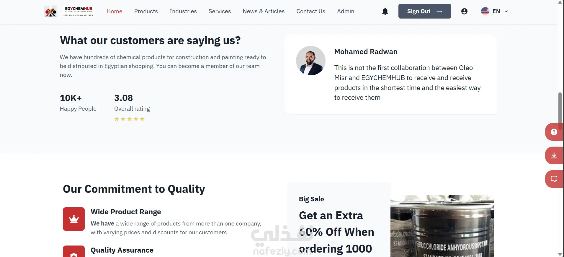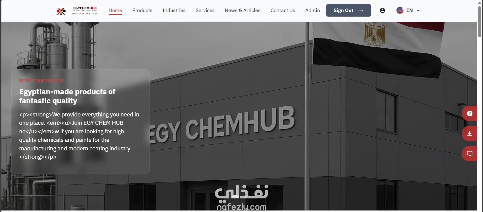 EGY CHEM HUB هو سوق إلكتروني يربط موردي المواد الكيميائية بالشركات في مصر والشرق الأوسط. يوفر أكثر من 1000 منتج كيميائي عبر مختلف الصناعات، مما يتيح للشركات تصفح المنتجات، وطلب عينات، وإجراء طلبات بالجملة مع الحصول على خصومات. كما توفر المنصة معلومات تفصيلية عن المنتجات، وشهادات السلامة، وخدمات الشحن الدولي لتسهيل عمليات شراء المواد الكيميائية للشركات الصناعية.