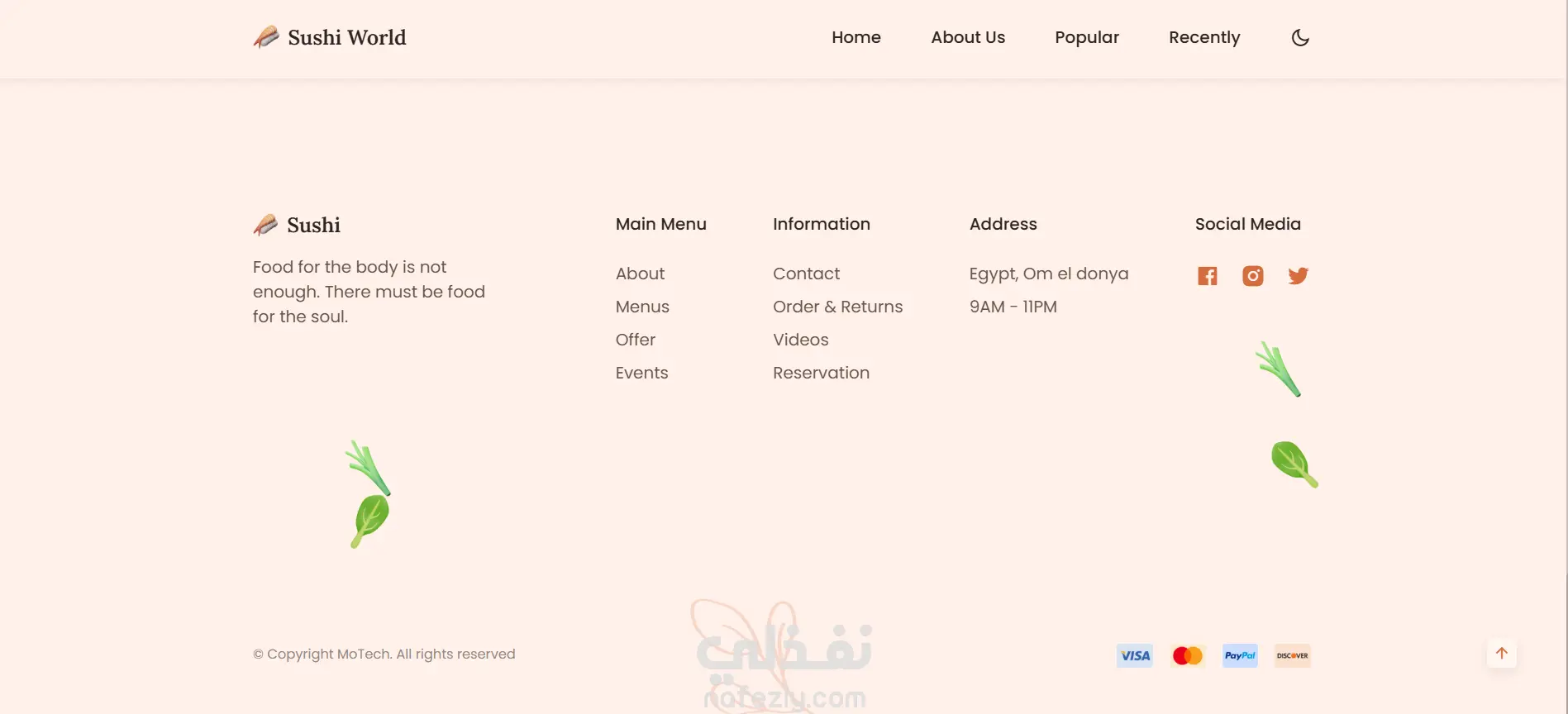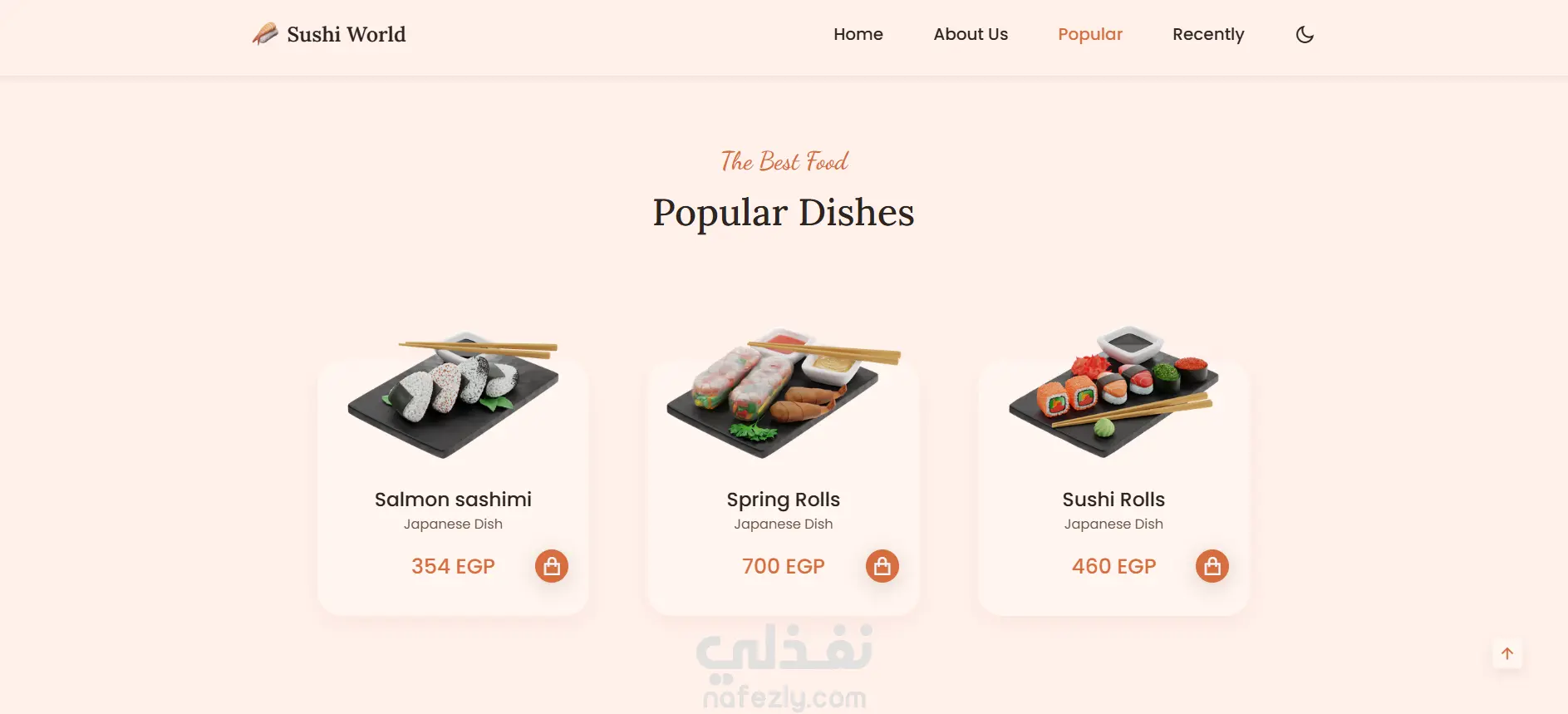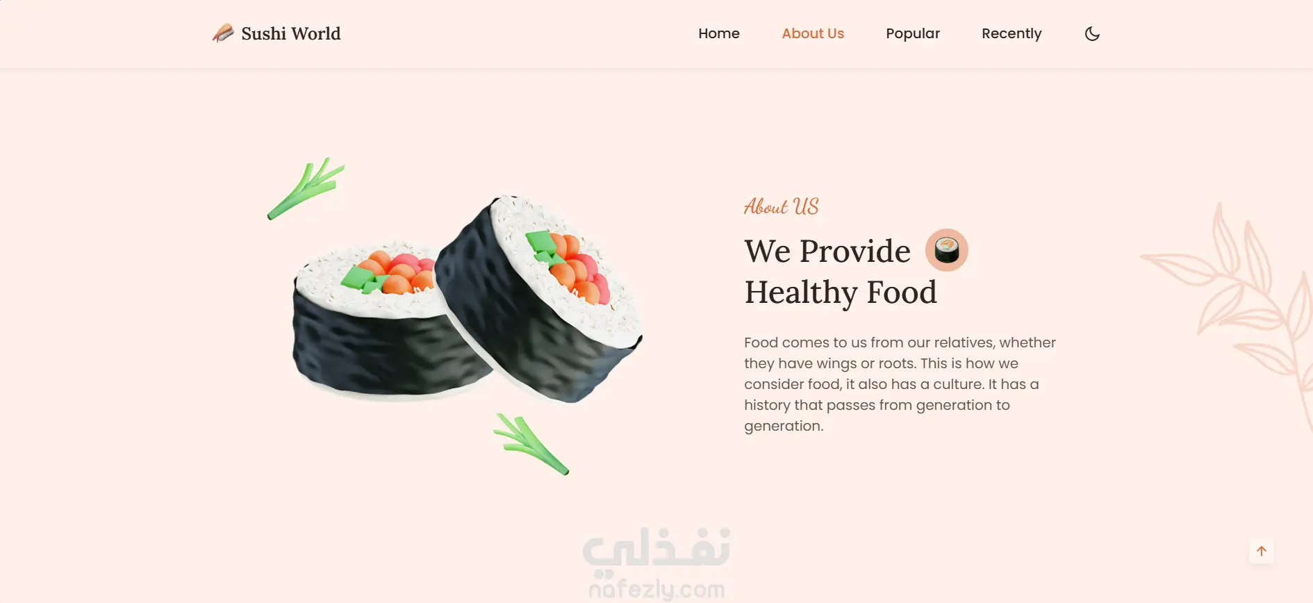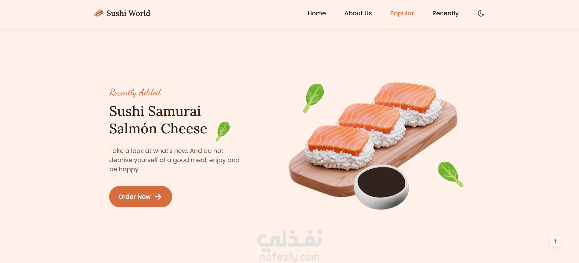 Sushi World هو موقع إلكتروني لمطعم سوشي يتيح للعملاء تصفح قائمة الطعام والتعرّف على الأصناف المتاحة بسهولة.