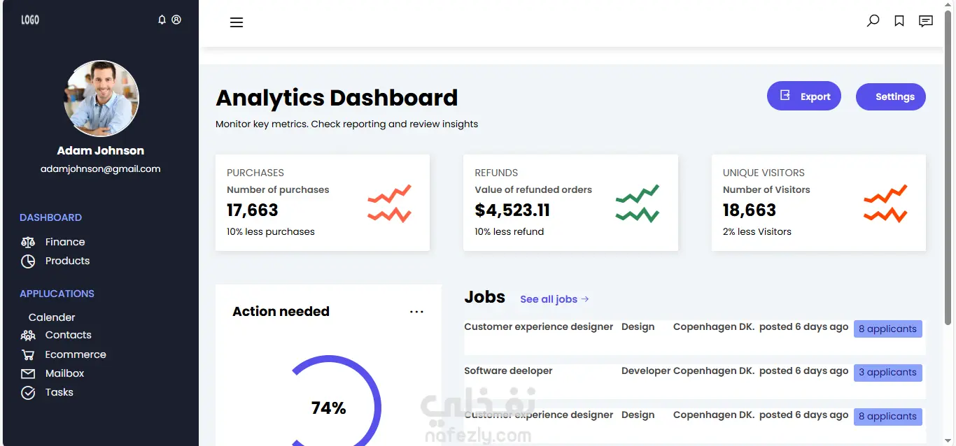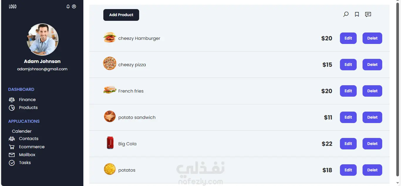 وحة تحكم تفاعلية (Dashboard) تم تطويرها باستخدام HTML وCSS وJavaScript لعرض الإحصائيات والبيانات بشكل منظم وسهل القراءة. يتضمن المشروع تصميم واجهة احترافية تحتوي على قائمة جانبية للتنقل (Sidebar)، وبطاقات لعرض المؤشرات والإحصائيات، مع إمكانية التنقل بين الصفحات، حيث يؤدي الضغط على قسم المنتجات (Products) إلى الانتقال إلى صفحة المنتجات الخاصة بالتطبيق. يركز المشروع على تنظيم المكونات، وتحسين تجربة المستخدم، بالإضافة إلى التعامل مع الأحداث والتنقل بين الصفحات باستخدام JavaScript.