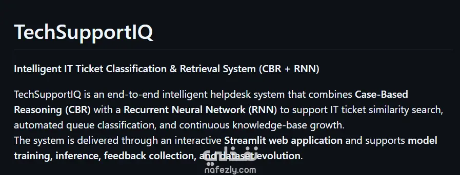 أقدّم خدمة تطوير نظام ذكي متكامل لإدارة تذاكر الدعم الفني (TechSupportIQ) يعتمد على الذكاء الاصطناعي وتعلّم الآلة لتحسين سرعة ودقة معالجة طلبات الدعم. النظام يجمع بين Case-Based Reasoning (CBR) والشبكات العصبية المتكررة (RNN – LSTM) لتقديم حل عملي وقابل للتطوير، ويتم عرضه من خلال تطبيق ويب تفاعلي باستخدام Streamlit. مميزات النظام: - استرجاع ذكي للتذاكر المشابهة (CBR): البحث الدلالي عن تذاكر دعم مشابهة تمثيل نصي هجين باستخدام: TF-IDF Word2Vec (متوسط التضمينات) حساب التشابه باستخدام Cosine Similarity إرجاع أفضل التذاكر المتشابهة (Top-K) مع: العنوان محتوى التذكرة الحل القسم (Queue) درجة التشابه - تصنيف تلقائي للتذاكر: نموذج LSTM لتوقّع قسم التذكرة تلقائيًا تدريب النموذج وتقييمه مباشرة من واجهة التطبيق حفظ وتحميل النماذج عرض درجة الثقة وأفضل 3 توقعات - معالجة نصوص متعددة اللغات: دعم اللغة الإنجليزية والألمانية تنظيف النصوص، إزالة التكرار، ومعالجة القيم المفقودة - التعلّم المستمر والتغذية الراجعة: تسجيل النتائج المفيدة إضافة حالات جديدة غير موجودة سابقًا لقاعدة المعرفة - التصور والتحليل: عرض توزيع التذاكر حسب الأقسام منحنيات الدقة والخسارة أثناء التدريب النظام مناسب للشركات، مراكز الدعم الفني، أو المشاريع البحثية التي تسعى لأتمتة الدعم وتحسين تجربة المستخدم.