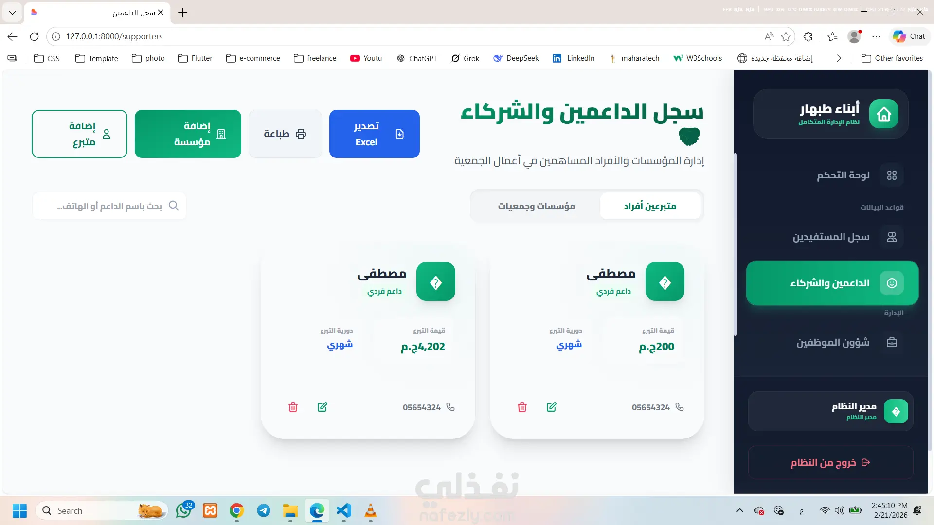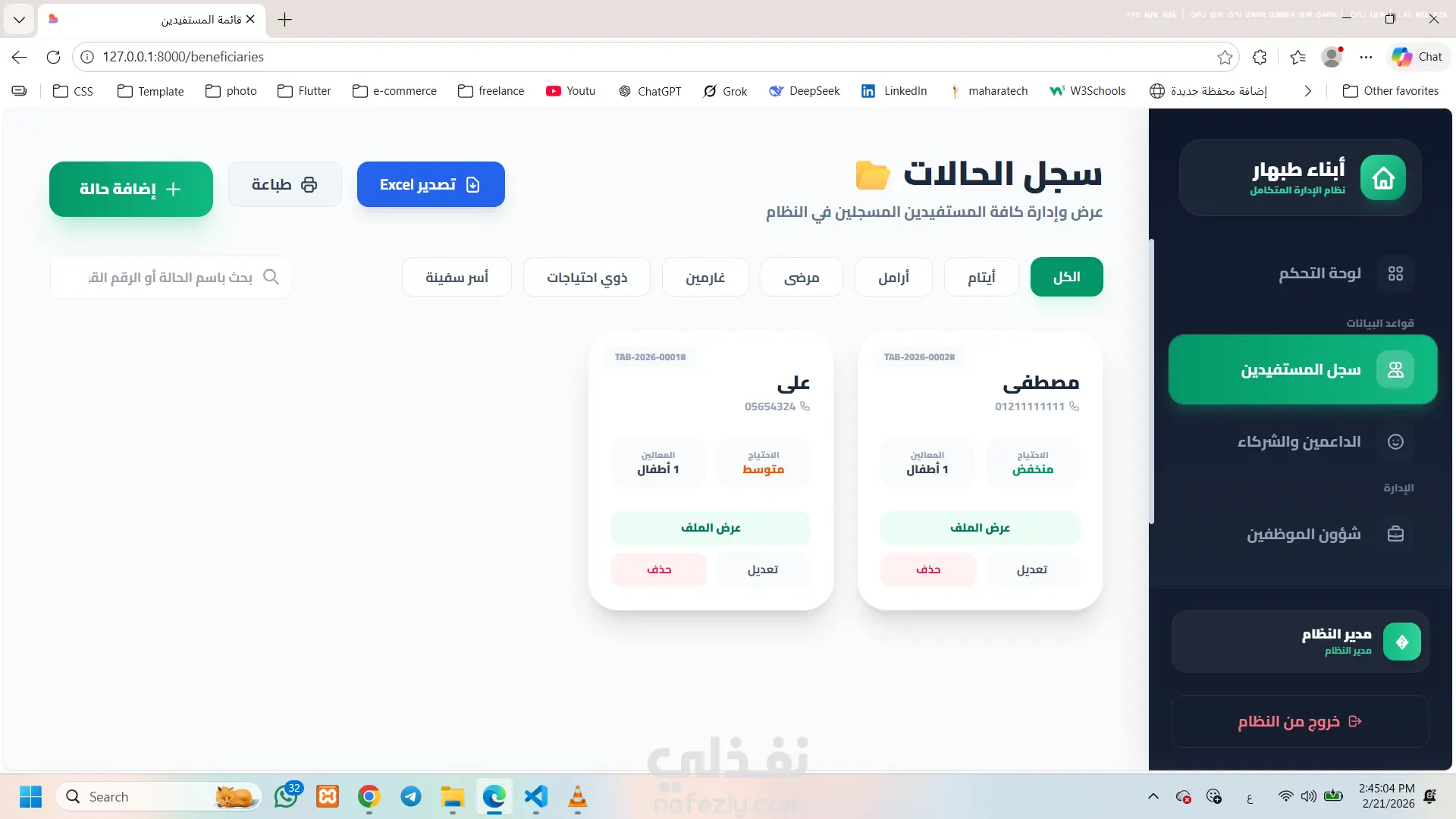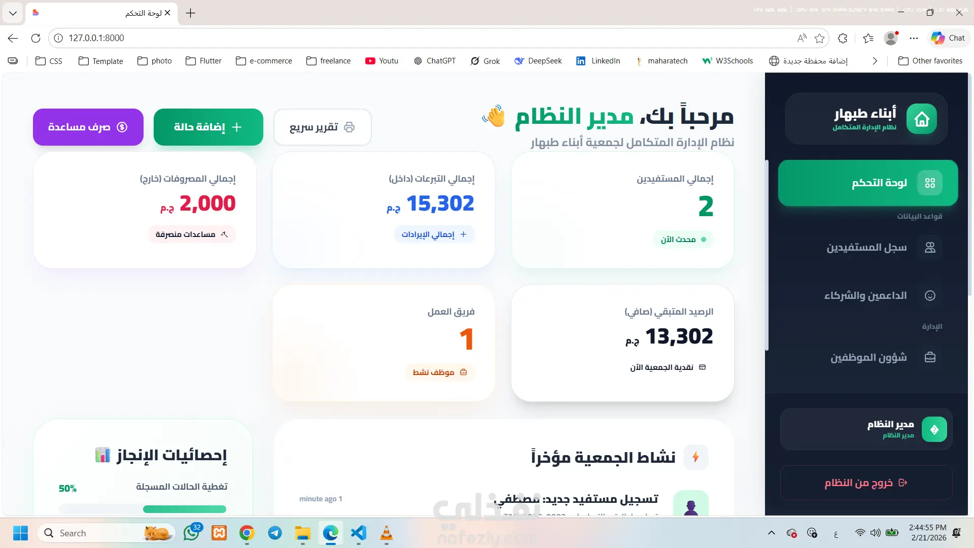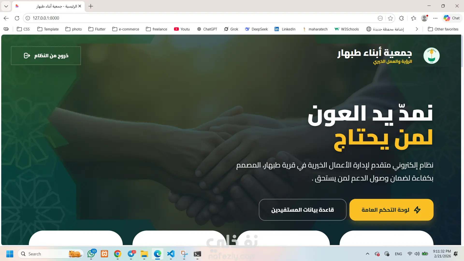 نظام إلكتروني متكامل لإدارة أعمال الجمعية الخيرية، يهدف إلى تنظيم بيانات المستفيدين والداعمين والموظفين وإدارة المساعدات بطريقة احترافية وسهلة الاستخدام، مع قابلية التوسع والتطوير مستقبلاً. فكرة المشروع: تحويل العمل الإداري من النظام الورقي إلى نظام رقمي متكامل يساهم في: تنظيم وحفظ البيانات بشكل آمن سرعة البحث والاستعلام طباعة الكشوفات والتقارير بسهولة متابعة المساعدات والتبرعات بدقة تقليل الأخطاء وتحسين كفاءة الإدارة 📌 يشمل النظام: تسجيل بيانات المستفيدين وحالاتهم الاجتماعية ونوع المساعدة المطلوبة مع إمكانية رفع المرفقات. تسجيل بيانات الداعمين (مؤسسات وأفراد) وتوثيق نوع الدعم ومواعيده. إدارة بيانات العاملين (الوظائف – الرواتب – الحضور والغياب). إضافة وتوثيق المساعدات بتاريخها ونوعها. نظام بحث متقدم وتقارير قابلة للطباعة. صفحة تعريفية بالجمعية وأنشطتها. إمكانية التطوير مستقبلاً (تبرعات أونلاين – تقارير مالية متقدمة – صلاحيات مستخدمين)