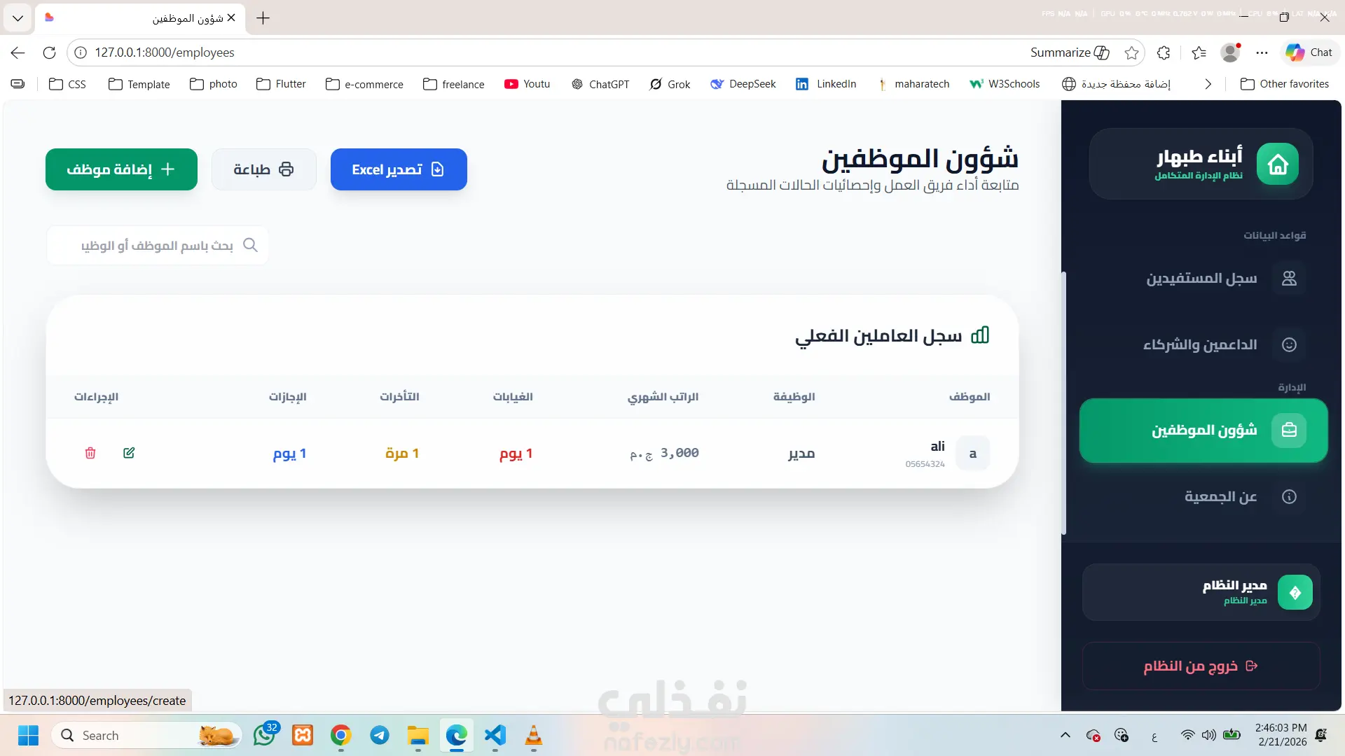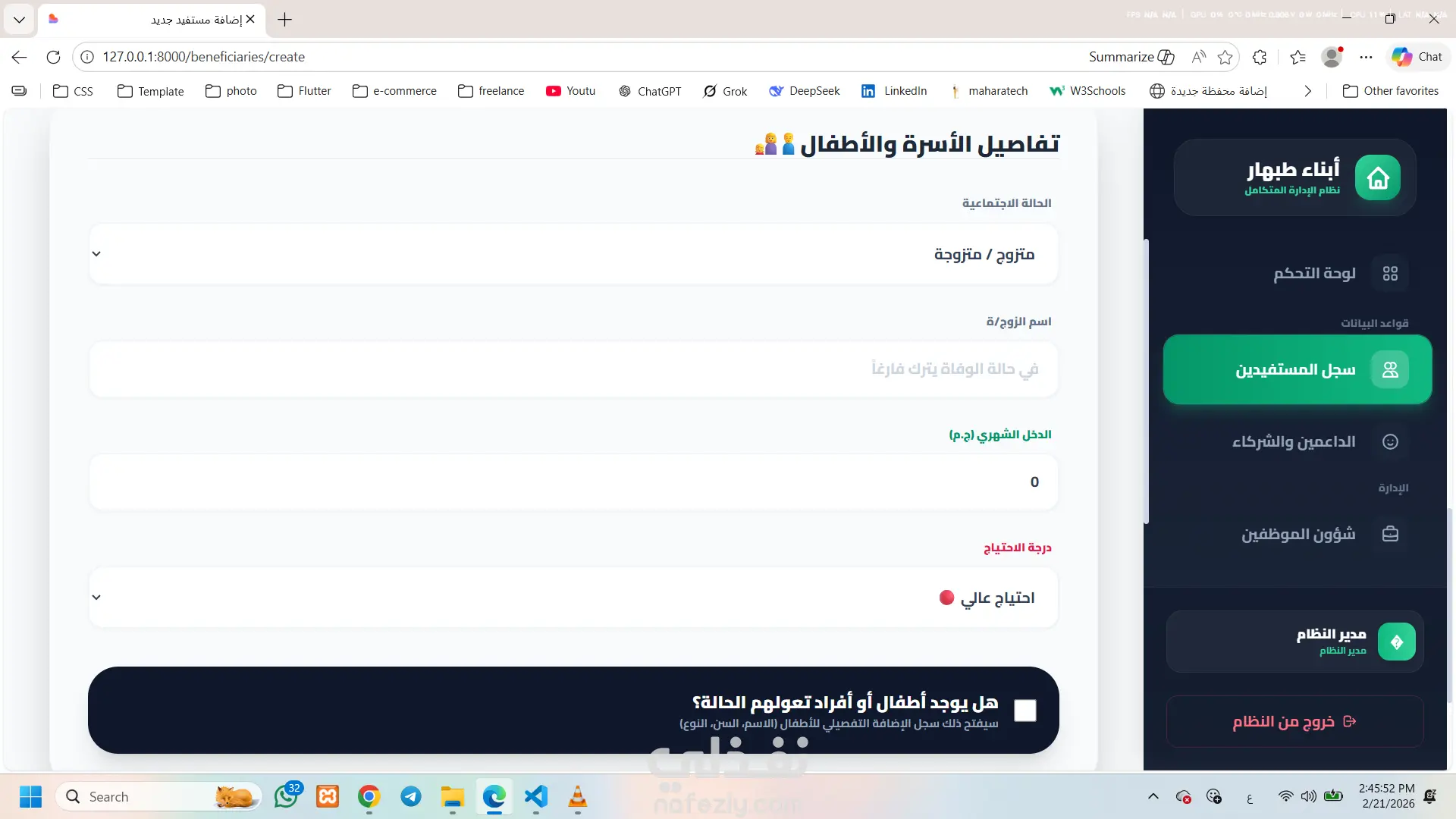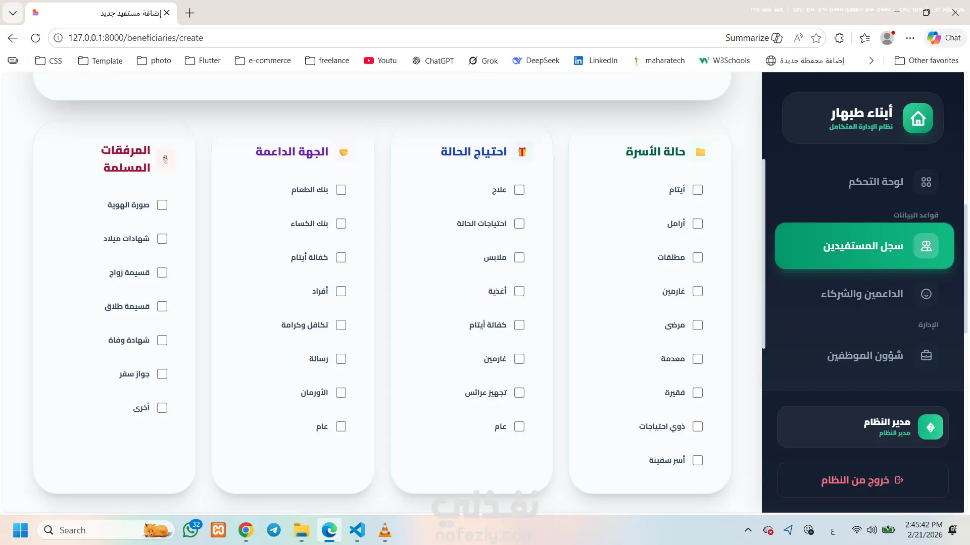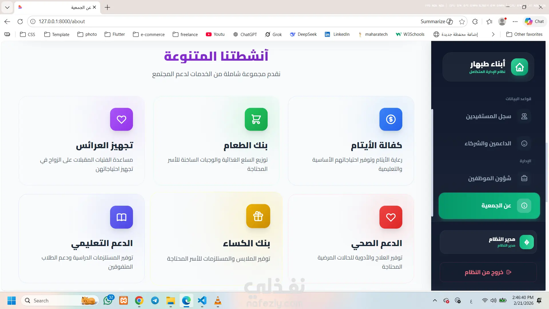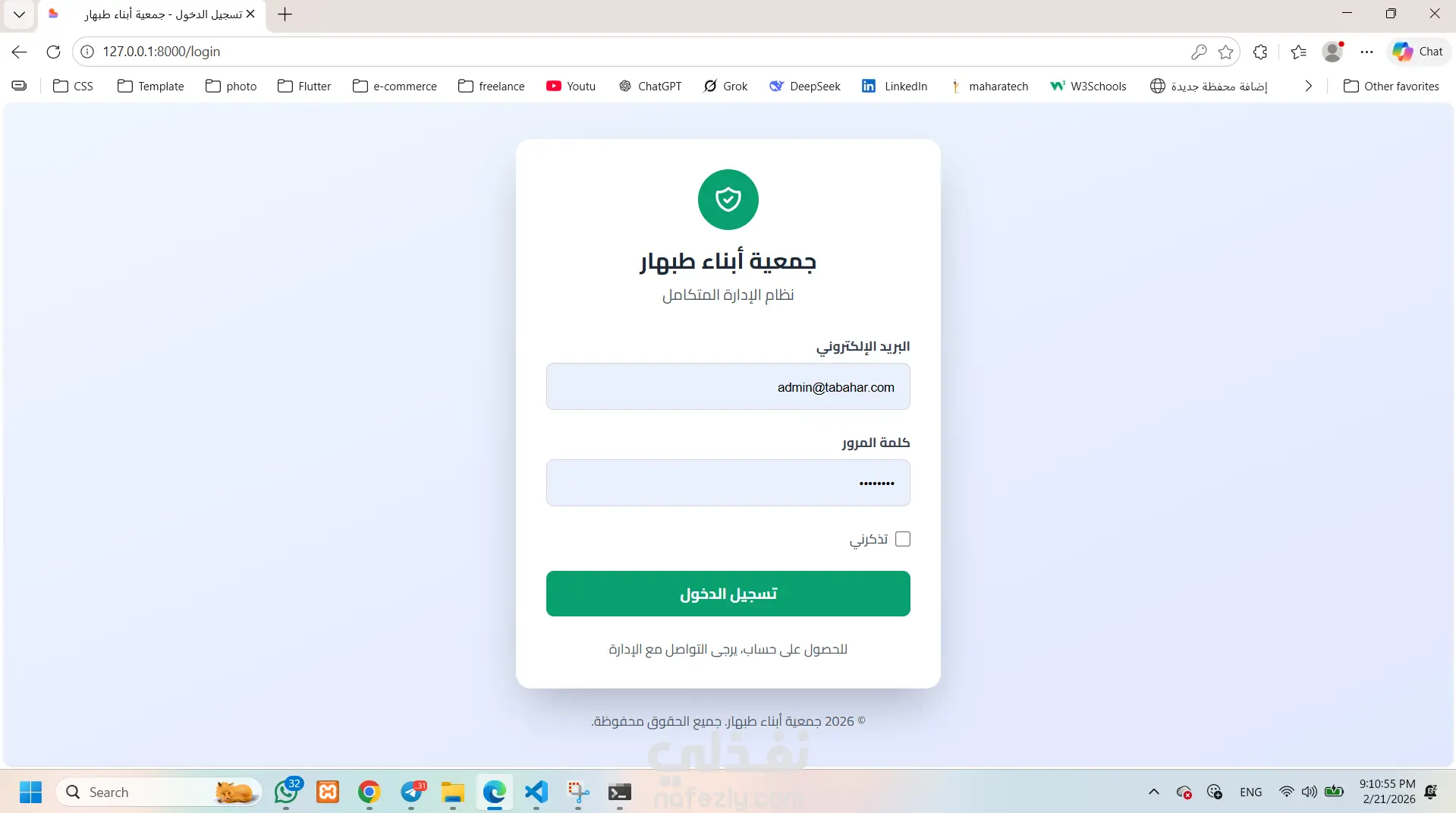 نظام إلكتروني متكامل لإدارة أعمال الجمعية الخيرية، يهدف إلى تنظيم بيانات المستفيدين والداعمين والموظفين وإدارة المساعدات بطريقة احترافية وسهلة الاستخدام، مع قابلية التوسع والتطوير مستقبلاً. فكرة المشروع: تحويل العمل الإداري من النظام الورقي إلى نظام رقمي متكامل يساهم في: تنظيم وحفظ البيانات بشكل آمن سرعة البحث والاستعلام طباعة الكشوفات والتقارير بسهولة متابعة المساعدات والتبرعات بدقة تقليل الأخطاء وتحسين كفاءة الإدارة 📌 يشمل النظام: تسجيل بيانات المستفيدين وحالاتهم الاجتماعية ونوع المساعدة المطلوبة مع إمكانية رفع المرفقات. تسجيل بيانات الداعمين (مؤسسات وأفراد) وتوثيق نوع الدعم ومواعيده. إدارة بيانات العاملين (الوظائف – الرواتب – الحضور والغياب). إضافة وتوثيق المساعدات بتاريخها ونوعها. نظام بحث متقدم وتقارير قابلة للطباعة. صفحة تعريفية بالجمعية وأنشطتها. إمكانية التطوير مستقبلاً (تبرعات أونلاين – تقارير مالية متقدمة – صلاحيات مستخدمين)