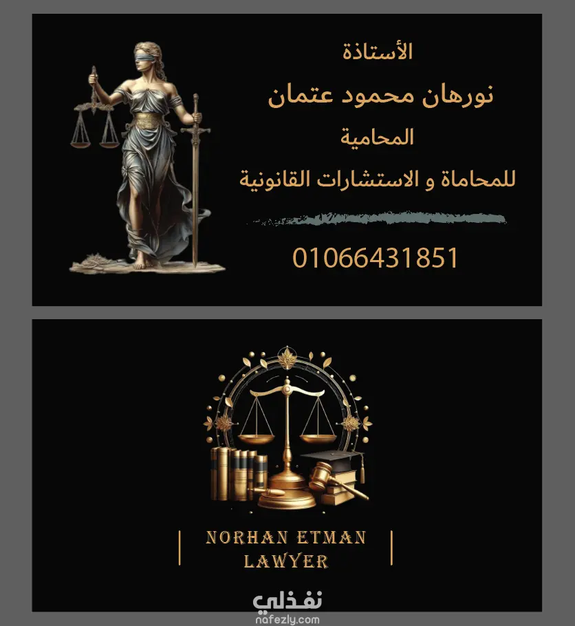 تم تنفيذ تصميم كارت شخصي احترافي للأستاذة نورهان محمود عثمان محامية للمحاماة والاستشارات القانونية. ركزت في التصميم على إبراز عنصر العدالة بشكل قوي من خلال استخدام تمثال سيدة العدالة والميزان والكتب القانونية لإيصال رسالة الثقة والاحترافية والخبرة.