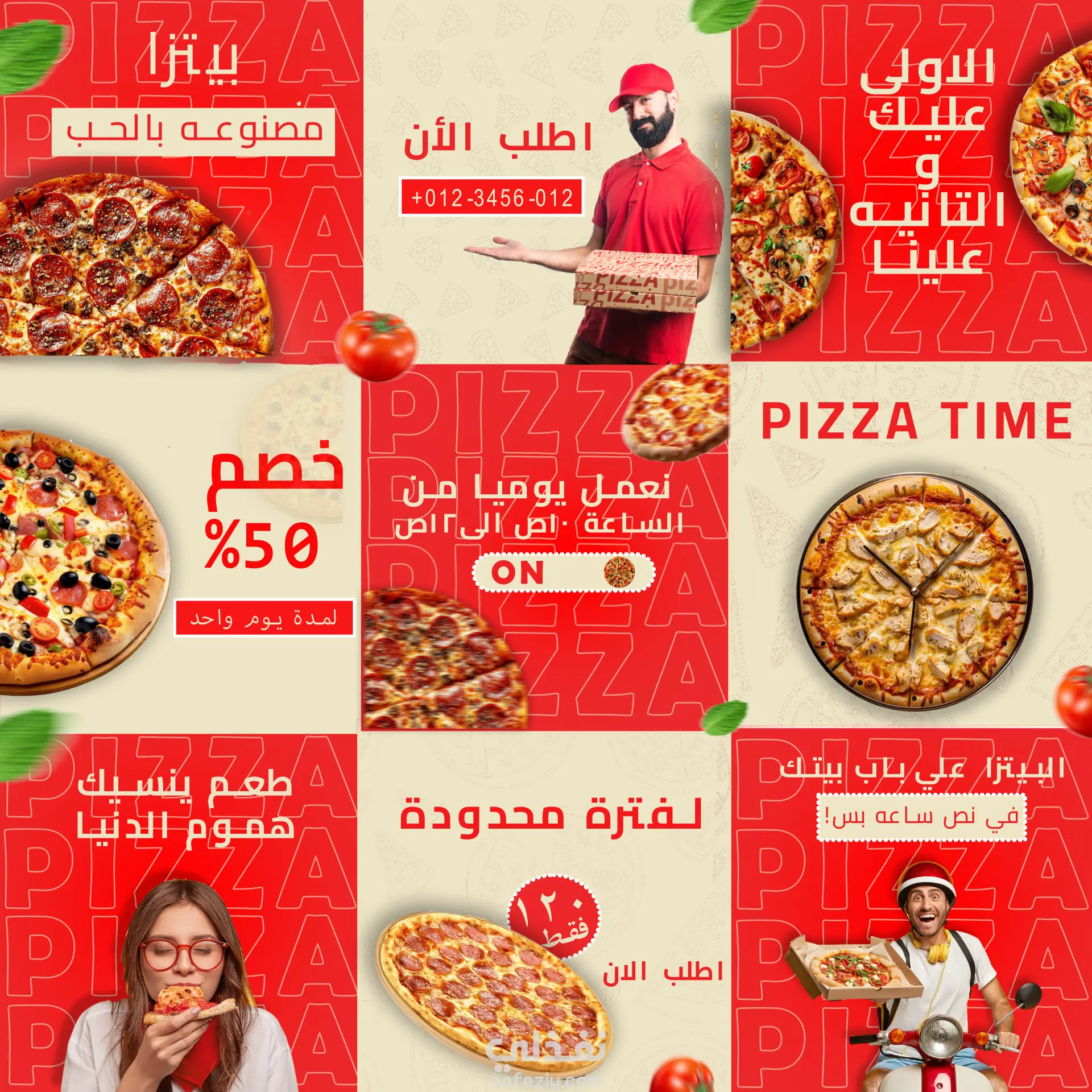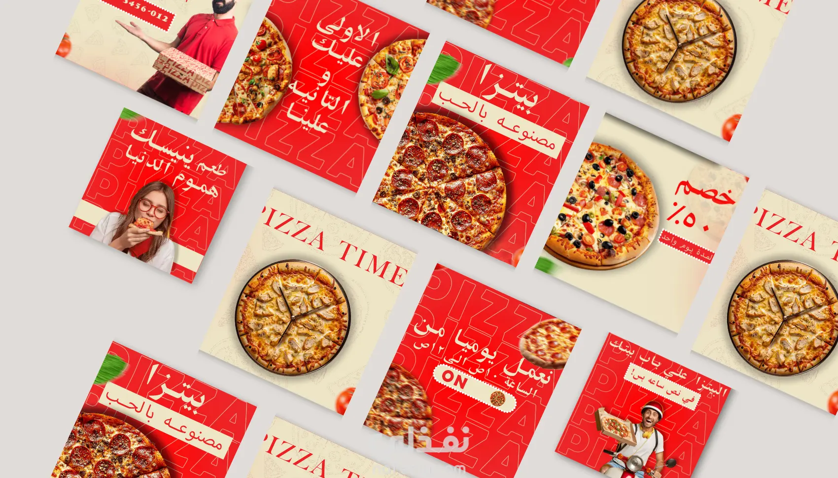 قمت بتصميم مجموعة متكاملة من المنشورات لمنصة إنستجرام بنظام (Grid Layout) لمطعم بيتزا، مع التركيز على إبراز العروض التسويقية بشكل بصري جذاب يحفز العميل على اتخاذ قرار الشراء فوراً.