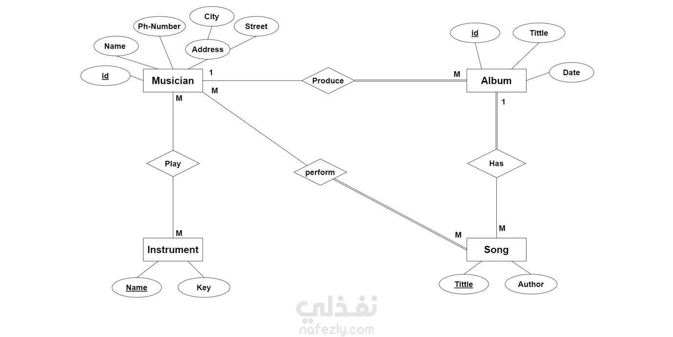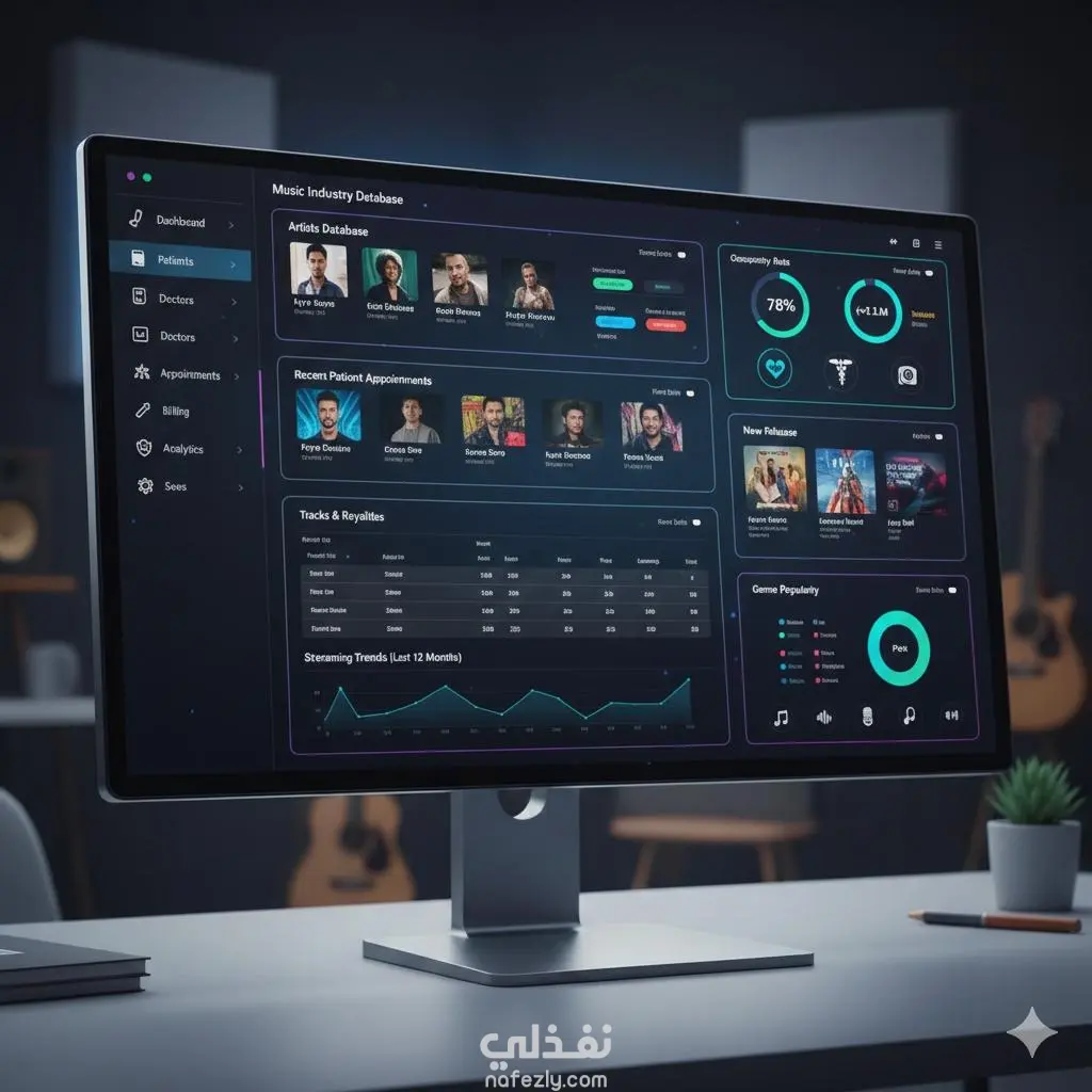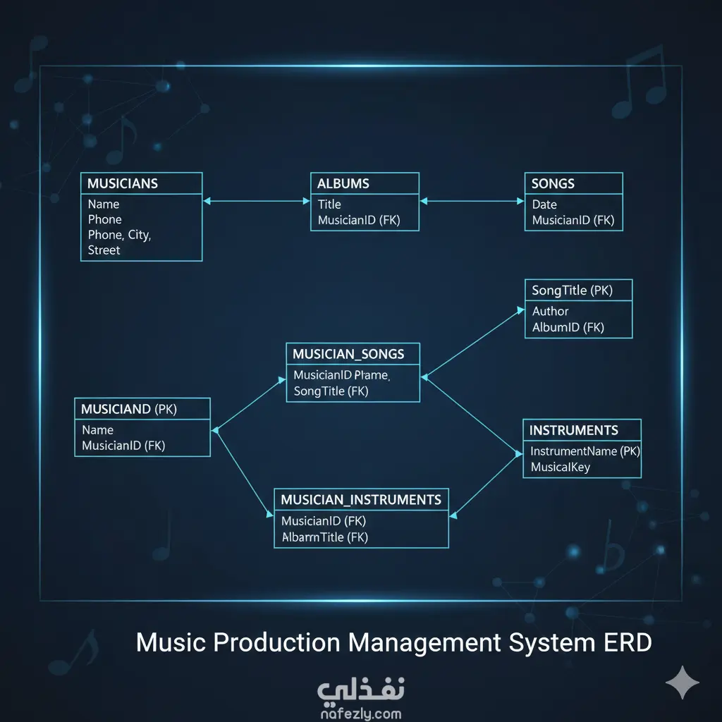 م تصميم وبناء هيكل قاعدة بيانات متكامل مخصص لشركات الإنتاج الموسيقي، يهدف إلى الربط المنطقي بين الفنانين (Musicians)، الألبومات، الأغاني، والآلات الموسيقية، مع ضمان تنظيم حقوق الملكية الفنية وتوزيع الأدوار.