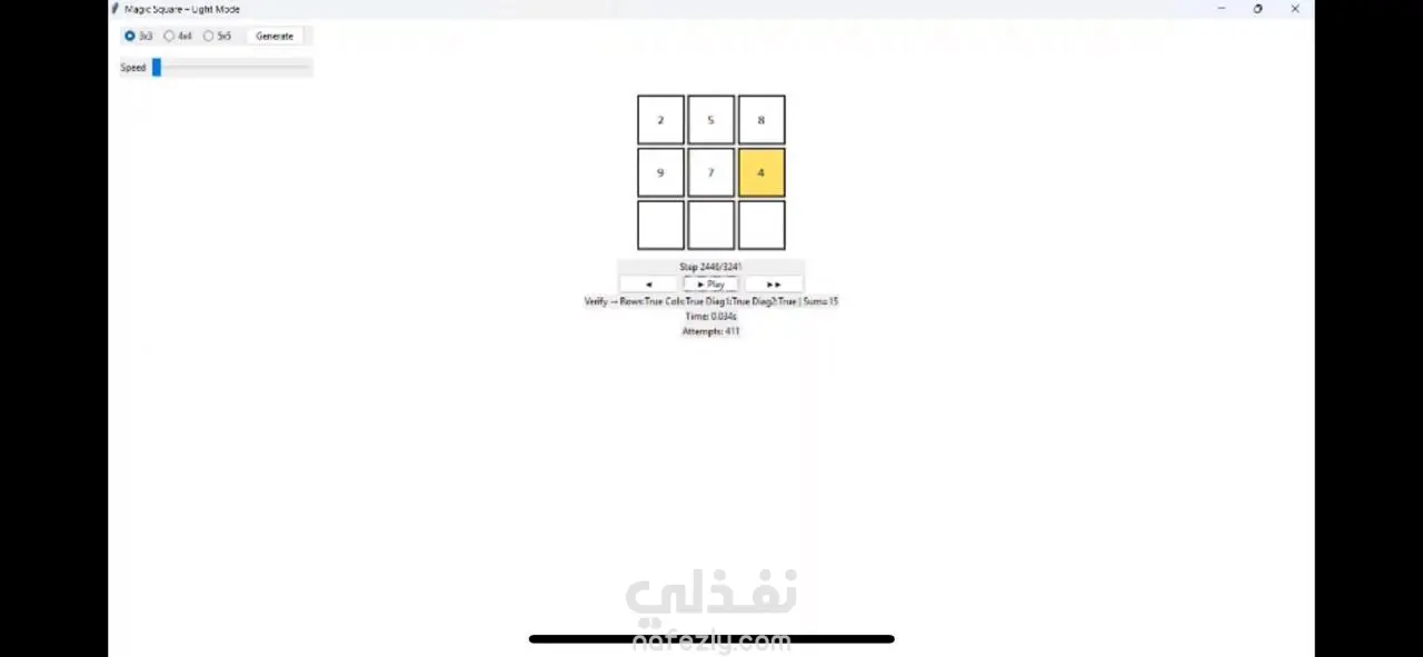 في هذا المشروع قمت بتطوير برنامج لحل Magic Square باستخدام لغة Python، حيث يقوم النظام بتوليد أو حل مربع سحري بحيث يكون مجموع الأرقام في كل صف وعمود وقطر متساوي.