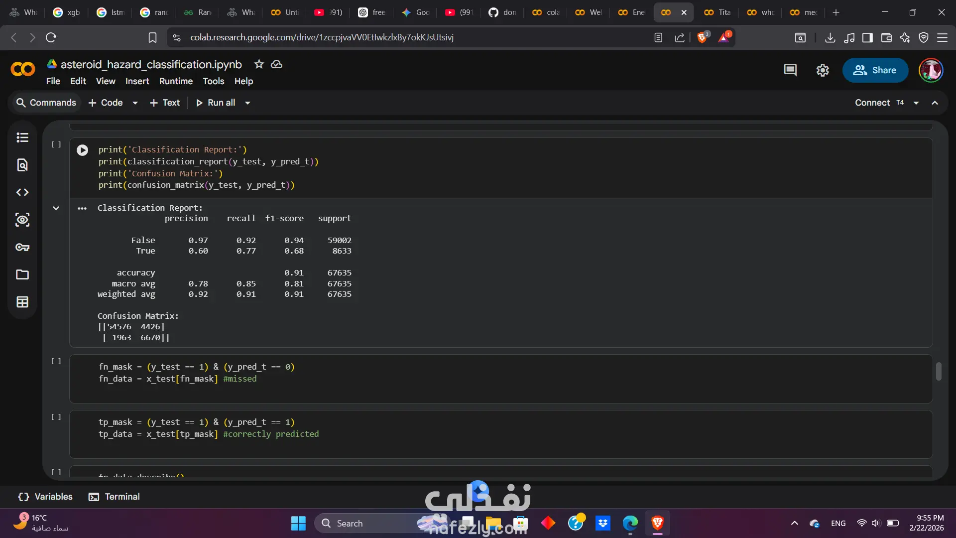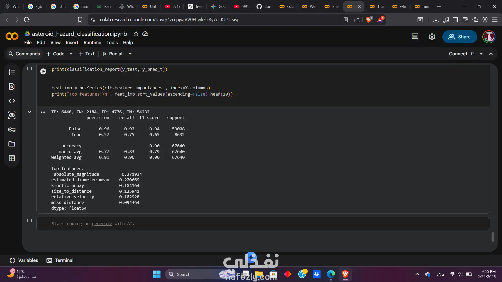 وصف المشروع: تطوير نموذج تنبؤي لتصنيف الأجسام القريبة من الأرض (NEOs) إلى "خطرة" أو "غير خطرة" بناءً على بيانات مجمعة من عام 1910 إلى 2024. ركز المشروع بشكل أساسي على تقليل نسبة الفقد (False Negatives) لأن تكلفة الخطأ في عدم اكتشاف كويكب خطر أعلى بكثير من التصنيف الخاطئ لكويكب غير خطر. التفاصيل التقنية والنتائج: الميزات الأهم: تبين أن القدر المطلق (Absolute Magnitude) هو العامل الأكثر تأثيراً في التصنيف بنسبة تقارب 27%. الأداء: حقق النموذج دقة إجمالية (Accuracy) تصل إلى 90%. التقييم: تم استخدام مصفوفة الارتباك (Confusion Matrix) لضبط النموذج، حيث نجح في تحديد 6448 حالة خطر صحيحة (True Positives) من إجمالي عينة الاختبار.