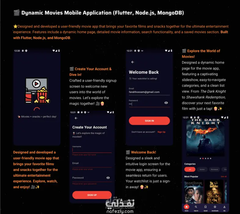 تطبيق Movie Vibes هو تطبيق أفلام ترفيهي متكامل صمّمته باستخدام Flutter وNode.js وقاعدة بيانات MongoDB، بهدف تقديم تجربة مشاهدة ممتعة وسهلة للمستخدمين. يتيح التطبيق للمستخدمين استكشاف الأفلام من خلال صفحة رئيسية ديناميكية تحتوي على عرض شرائح جذّاب وتصنيفات مرتبة وقائمة أفلام سهلة التصفح. كما يوفّر معلومات تفصيلية لكل فيلم تشمل القصة، والممثلين، والتقييمات، والمقاطع الدعائية، مع إمكانية المشاهدة أو التحميل بسهولة. يحتوي التطبيق أيضًا على شاشة تسجيل دخول وتسجيل حساب جديدة بتصميم أنيق وسلس، بالإضافة إلى ميزة البحث الذكي للوصول السريع للأفلام، وقسم مخصص لحفظ الأفلام المفضلة مثل The Shawshank Redemption وThe Godfather ليتمكن المستخدم من الرجوع إليها في أي وقت. كما تم تصميم صفحة شخصية لإدارة الحساب والإعدادات. التطبيق يجمع بين المتعة والبساطة ليمنح المستخدم تجربة سينمائية فريدة من نوعها.