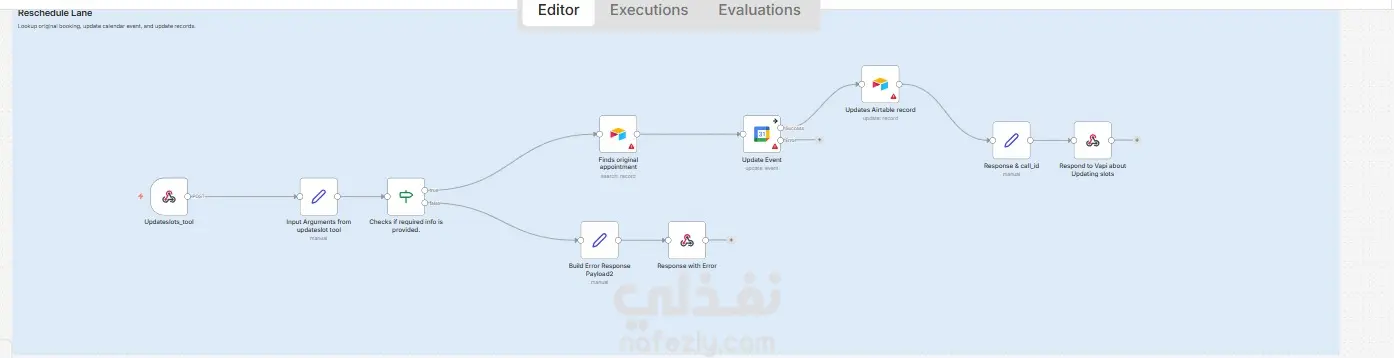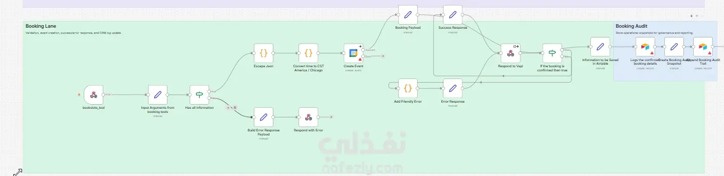 قمت بتطوير نظام استقبال مواعيد ذكي يعمل عبر WhatsApp Voice Agent باستخدام n8n، حيث يستقبل طلبات العملاء صوتيًا، يتحقق من توافر المواعيد، يقوم بحجزها تلقائيًا، ويديرها بالكامل دون تدخل بشري. يشمل النظام إنشاء Webhooks مخصصة للتعامل مع أدوات عرض المواعيد المتاحة، حجز موعد، وإعادة جدولة موعد. تم ربط النظام مباشرة بـ Google Calendar للتحقق من التوافر وإنشاء الأحداث تلقائيًا، مع توليد فترات زمنية مدتها 30 دقيقة داخل ساعات العمل المحددة، واقتراح نطاقات زمنية متاحة بشكل واضح. تم تنفيذ معالجة متقدمة للتوقيت باستخدام Luxon لتحويل التوقيت تلقائيًا إلى America/Chicago، بالإضافة إلى إنشاء رابط Google Meet تلقائي مع كل حجز. كما يتم تخزين جميع بيانات الحجز في Airtable، بما يشمل الاسم، البريد الإلكتروني، رقم الهاتف، رابط الاجتماع، حالة الحجز، ومعرف تسجيل المكالمة. يدعم النظام كذلك إعادة جدولة المواعيد مع تحديث البيانات في كل من Google Calendar وAirtable. تم تصميم الردود بصيغة JSON متوافقة مع Vapi Voice Agent لضمان تكامل سلس مع أنظمة المساعد الصوتي، بالإضافة إلى معالجة الأخطاء برسائل واضحة ومناسبة للمستخدم. التقنيات المستخدمة: n8n – Google Calendar API – Airtable – JavaScript Code Nodes – Luxon – Webhooks – Vapi النظام مصمم ليعمل كسكرتير افتراضي ذكي للشركات والعيادات ومقدمي الخدمات، بهدف أتمتة عملية حجز المواعيد وتقليل التدخل البشري وتحسين تجربة العملاء.