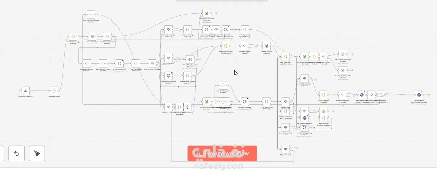 قمت بتطوير نظام أتمتة متكامل باستخدام n8n لإدارة محادثات WhatsApp الواردة، تحليل نية العميل باستخدام AI Agent، حجز الاجتماعات تلقائيًا عبر Cal.com، وتحديث بيانات العملاء وفرص البيع داخل HighLevel CRM. يعتمد النظام على منطق ذكي لاتخاذ القرار بناءً على حالة العميل (New Lead – Interested – Qualified – Customer – Not Interested)، مع منع تراجع المراحل داخل الـ Pipeline والحفاظ على تسلسل منطقي لتطور الفرصة البيعية. أهم مميزات النظام: استقبال رسائل WhatsApp الواردة وتصفية الأحداث غير الصالحة تحليل الرسائل باستخدام AI Agent لتحديد النية والحالة إنشاء أو تحديث Contact داخل HighLevel مع تحديث Custom Fields إدارة Lead Scoring وSentiment وIntent Tracking إنشاء Opportunity تلقائيًا داخل Pipeline المناسب حجز الاجتماعات عبر Cal.com API (v2) إرسال رسالة تأكيد الحجز عبر WhatsApp (BotPenguin API) دعم اللهجات العربية المختلفة (Neutral / Egyptian / Saudi) في رسائل التأكيد إدارة Followup Loop تلقائيًا مع شروط إيقاف ذكية منع التكرار في Conversation History مع ضغط البيانات عند تجاوز الحد إعادة فتح العملاء غير المهتمين عند إعادة التفاعل حماية من خفض المرحلة (Stage Downgrade Protection) التقنيات المستخدمة: n8n – Cal.com API – HighLevel CRM – OpenAI API – BotPenguin API – JavaScript Code Nodes – Webhooks – Advanced Conditional Logic النظام مصمم للشركات التي تعتمد على WhatsApp كمصدر أساسي لتوليد العملاء، ويحول المحادثات إلى عملية بيع منظمة ومؤتمتة بالكامل دون تدخل بشري مستمر.