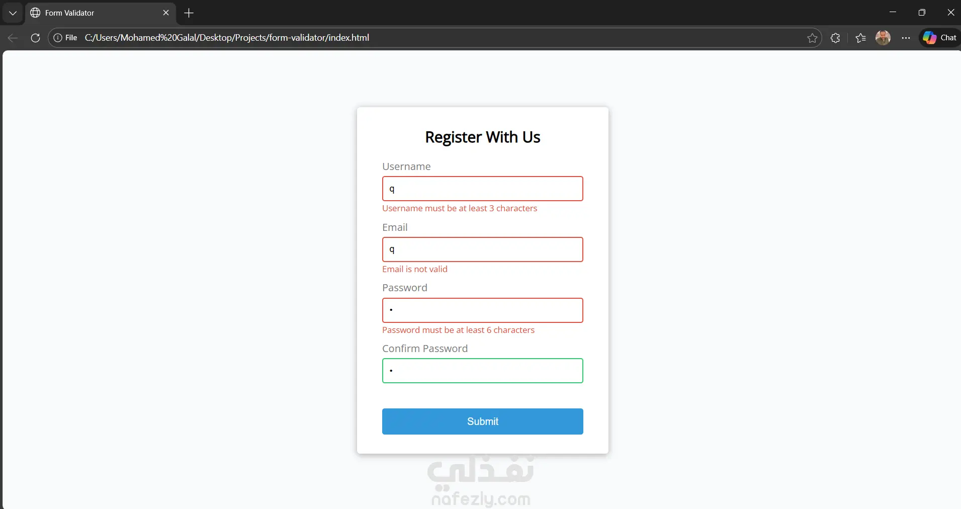 مشروع بسيط عبارة عن صفحة ويب تحتوي على نموذج إدخال بيانات (Form) مع خاصية التحقق من صحة المدخلات باستخدام JavaScript. النموذج يتأكد من أن الحقول مثل البريد الإلكتروني وكلمة المرور مكتوبة بشكل صحيح قبل الإرسال، ويعرض رسائل تنبيه للمستخدم عند وجود أخطاء. الهدف من المشروع هو إبراز مهاراتي في بناء واجهات تفاعلية بسيطة مع التركيز على تجربة المستخدم وجودة البيانات المدخلة.
