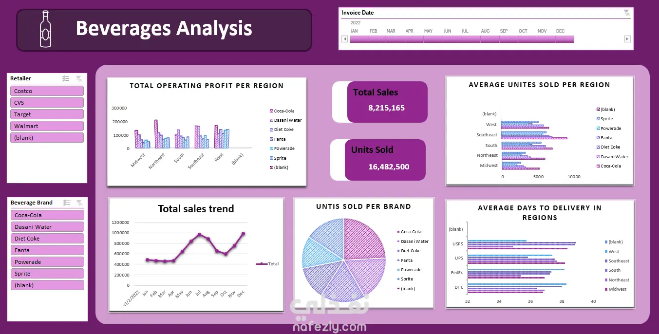 تحليل بيانات مبيعات المشروبات بهدف تحسين اداره المخزون والزياده الربحيه تحليل اجمالي المبيعات تحليل اجمال القطع المباعه مقارنه الاداء بين المنتجات تحليل الاتجاهات الموسميه مقارنه عدد الايام للتوصيل حسب المناطق خطوات العمل: • تنظيف البيانات ومعالجة القيم المفقودة • حساب مؤشرات الأداء الرئيسية (KPIs) • إنشاء Dashboard تفاعلي لعرض النتائج الأدوات المستخدمة: Excel