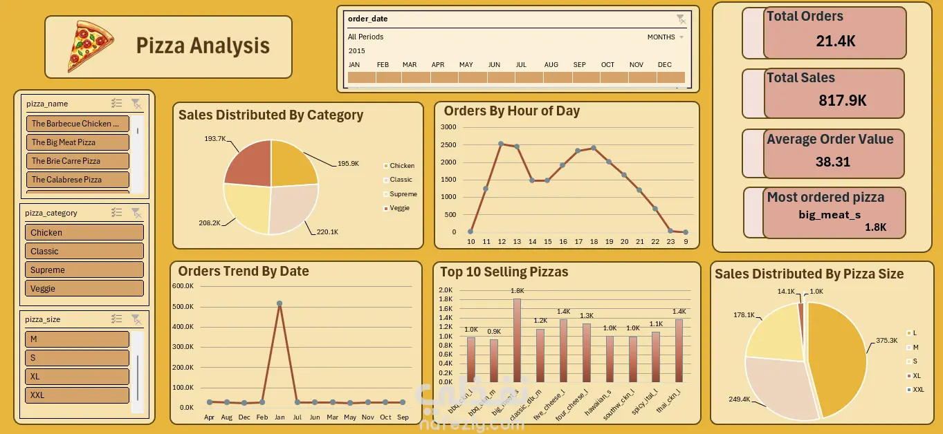 تحليل بيانات مبيعات بيتزا لفهم سلوك العملاءوتحديد المنتجات الاعلى مبيعا وتحسين القرارات التسويقيه وزياده الارباح تحليل اجمالي المبيعات Total sales حساب عدد المبيعات ومتوسط قيمه الاوردر تحليل المبيعات حسب الوقت معرفه اوقات الذروه (peak hours) خطوات العمل: • تنظيف البيانات ومعالجة القيم المفقودة • حساب مؤشرات الأداء الرئيسية (KPIs) • إنشاء Dashboard تفاعلي لعرض النتائج الأدوات المستخدمة: Excel