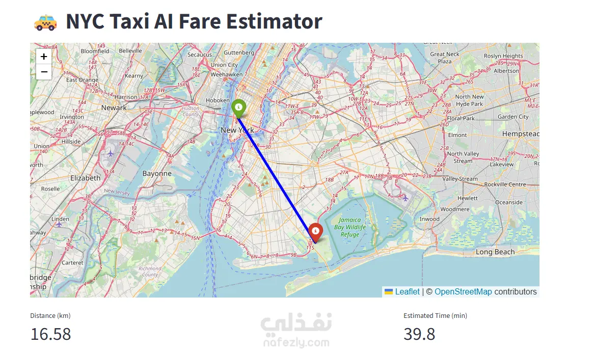 احسب أجرة رحلتك قبل ما تتحرك! تطبيق ذكي لتقدير أجرة سيارات الأجرة في نيويورك، يعتمد على ذكاء اصطناعي حقيقي لتوقع السعر بدقة عالية. اختار نقطة الانطلاق والوصول على الخريطة، وعدد الركاب، وشوف التكلفة والمسافة والوقت المتوقع فورًا، كل ده في واجهة تفاعلية سلسة وعصرية ميزات المشروع: تقدير الأجرة بناءً على: موقع الانطلاق والوصول، عدد الركاب، وتاريخ ووقت الرحلة. عرض الخريطة التفاعلية لتحديد موقع الانطلاق والوصول بسهولة عن طريق النقر. حساب المسافة بالكم والتقدير الزمني للرحلة تلقائيًا. واجهة مستخدم جذابة وسهلة الاستخدام مع تحديث ديناميكي للنتائج. دعم تجربة احترافية للعرض على الويب باستخدام Streamlit. التقنيات المستخدمة: Python (Pandas, NumPy) مكتبات التعلم الآلي (LightGBM / Random Forest) Streamlit لإنشاء واجهة الويب Folium للخريطة التفاعلية Geopy لحساب المسافة بين النقاط