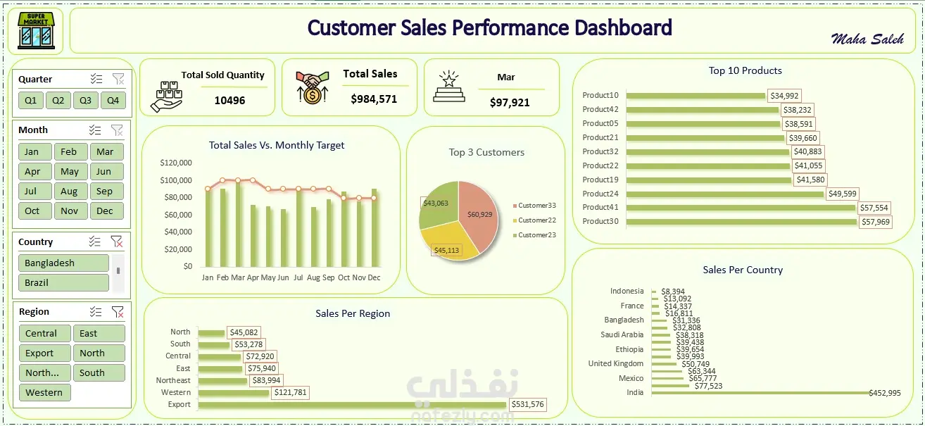 مخصصة لتحليل أداء العملاء والمبيعات، مع التركيز على أفضل العملاء، المنتجات الأعلى مبيعًا، والأداء حسب الدول والمناطق. تساعد على فهم سلوك العملاء وتحسين استراتيجيات البيع. المميزات وطريقة التنفيذ: تحليل المبيعات حسب العملاء، المنتجات، والدول مقارنة الأداء الشهري مع الأهداف المحددة تصفية البيانات حسب الربع، الشهر، الدولة، والمنطقة تصميم تفاعلي يسهل استخراج Insights سريعة