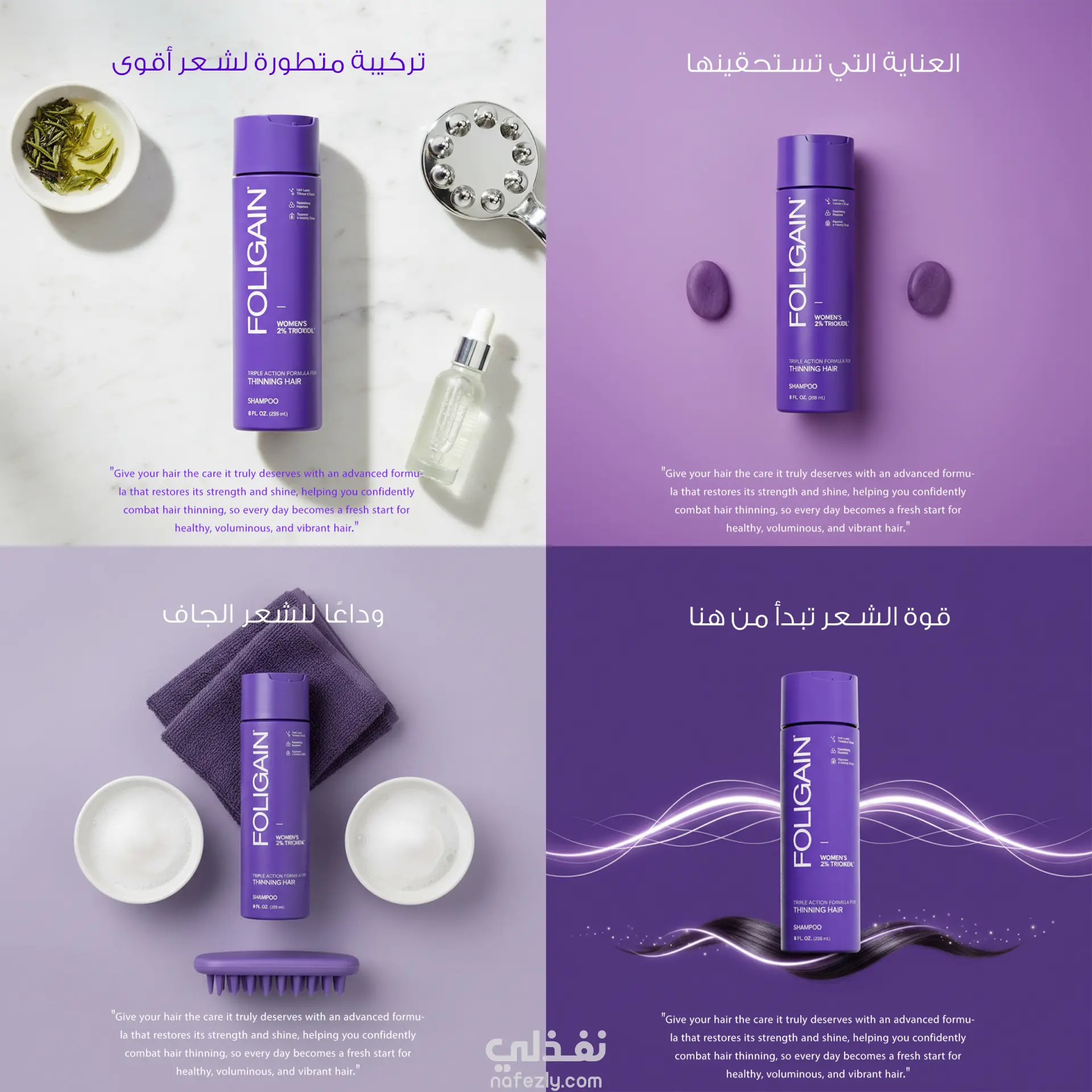 الفكرة الأساسية: “قوة الشعر تبدأ من هنا” – إبراز الشامبو كحل متكامل يعيد للشعر قوته، كثافته، ولمعانه. الأسلوب البصري: خلفيات نظيفة ومتدرجة بالبنفسجي لتعزيز الهوية البصرية. عرض المنتج في لقطات مختلفة (مكونات طبيعية، أدوات عناية، تأثيرات ضوئية ديناميكية). دمج عناصر توحي بالقوة والحيوية مثل موجات الضوء وخصل الشعر اللامعة. الرسائل التسويقية: تركيبة متطورة للشعر الأضعف. عناية عميقة للشعر الجاف والخفيف. نتائج يومية ملموسة (قوة – كثافة – لمعان). باختصار: كامبين يركز على إبراز المنتج كحل علمي فاخر يمنح المرأة شعرًا أقوى وأكثر حيوية من أول استخدام.