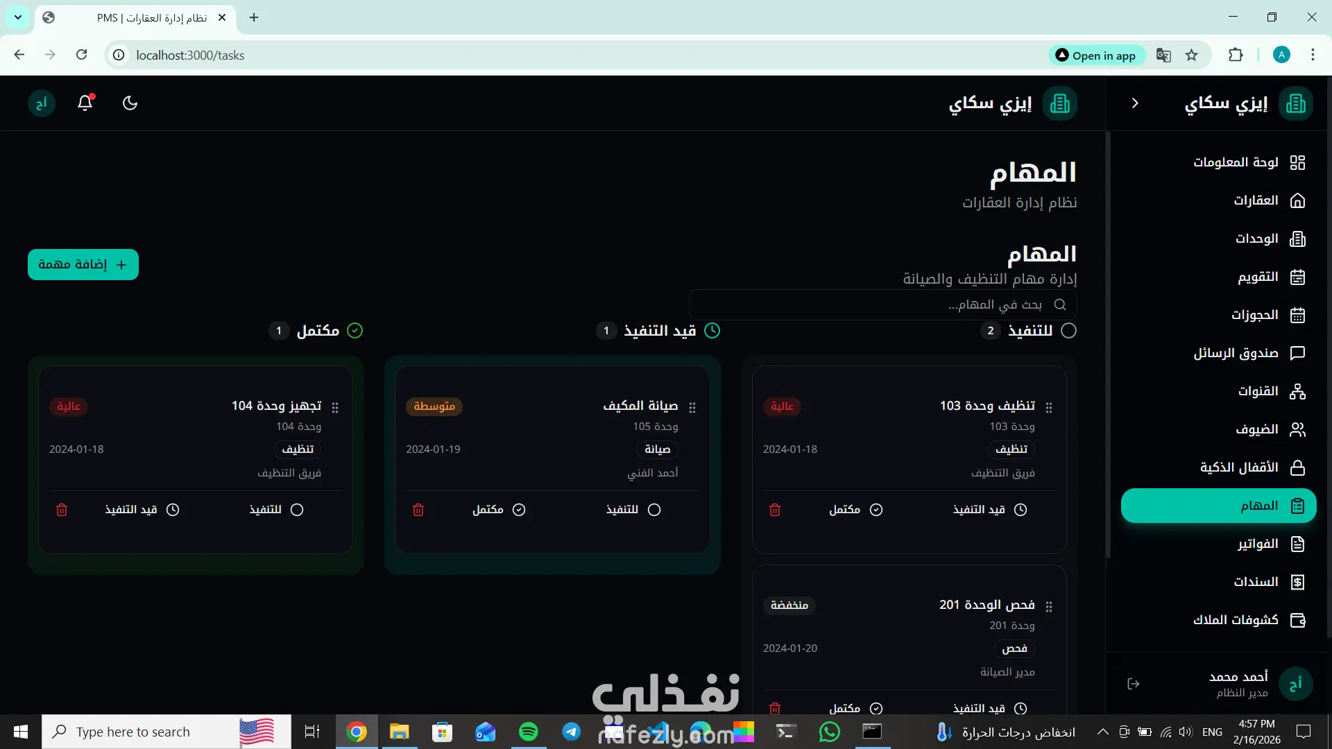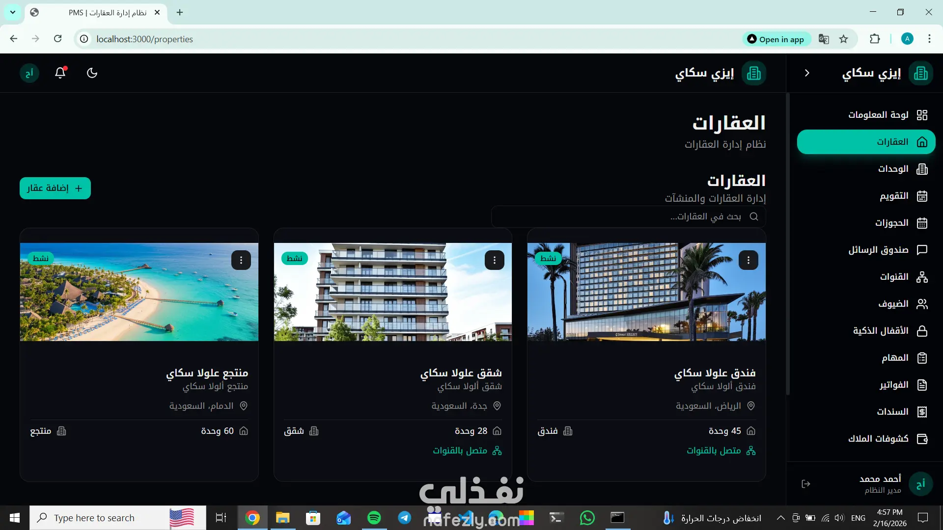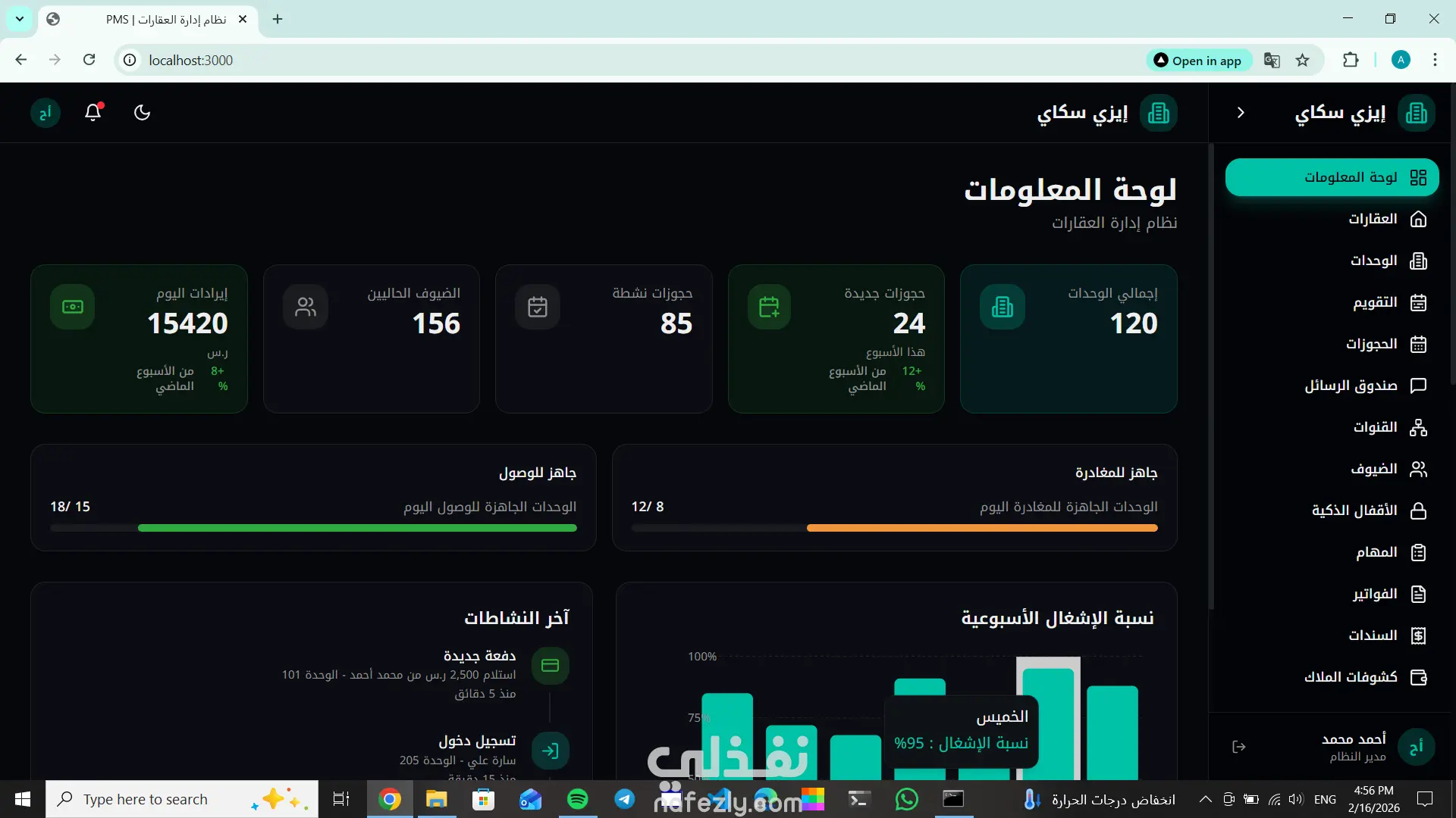 تطوير PMS Dashboard (Property Management System Dashboard) احترافية لإدارة العقارات أو الفنادق بكفاءة عالية، توفر عرضًا لحظيًا لجميع البيانات التشغيلية والمالية في واجهة سهلة الاستخدام وسريعة الأداء. تساعد لوحة التحكم أصحاب الفنادق، الشقق الفندقية، وشركات إدارة العقارات على متابعة الحجوزات، الإشغال، الإيرادات، والمدفوعات في مكان واحد، مما يسهّل اتخاذ القرار وتحسين الأداء التشغيلي. ? المميزات التي يشملها النظام: عرض عدد الغرف المتاحة والمحجوزة متابعة تسجيل الدخول والخروج (Check-in / Check-out) تقارير الإيرادات اليومية / الشهرية إدارة بيانات العملاء والحجوزات نظام صلاحيات للمستخدمين (Admin / Staff) رسوم بيانية وتحليلات فورية للأداء واجهة تفاعلية وسريعة الاستجابة (Responsive) ? التقنيات المستخدمة: Frontend: React / Next.js Backend: Node.js & Express Database: MongoDB RESTful API Architecture حماية وأمان للبيانات (Authentication & Authorization) ? الهدف من النظام: تحسين إدارة العمليات اليومية، تقليل الأخطاء اليدوية، وتوفير رؤية واضحة لأداء المنشأة في الوقت الفعلي