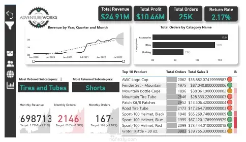 • Created custom DAX measures for advanced metrics (YTD Revenue, Adjustment Price, Return Rate, Profit Targets, etc.)