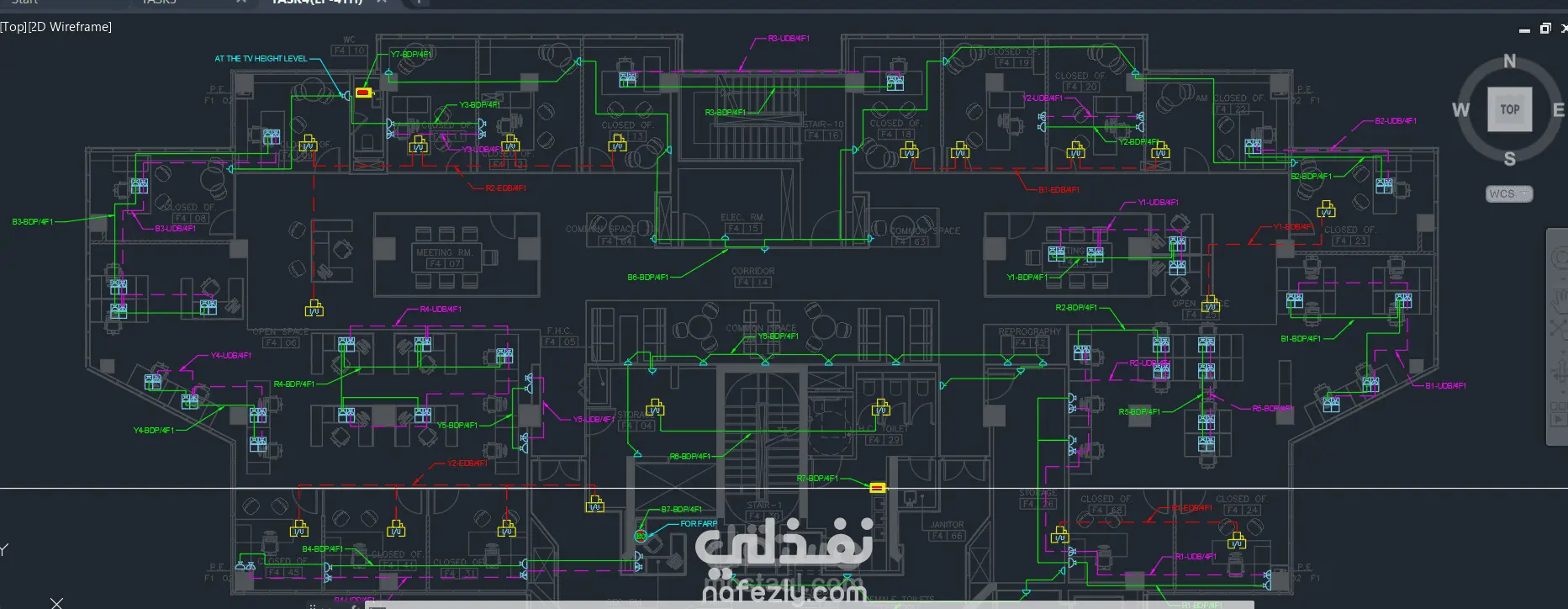 تصميم اعمال الباور للبنك العربي الافريقي (توزيع مقابس الكهرباء لتساعد في خدمه العاملين في البنك واماكن فتحات الداتا ووضع اماكن السوتشات لتغذية الاحمال الميكانيكه في المبني)