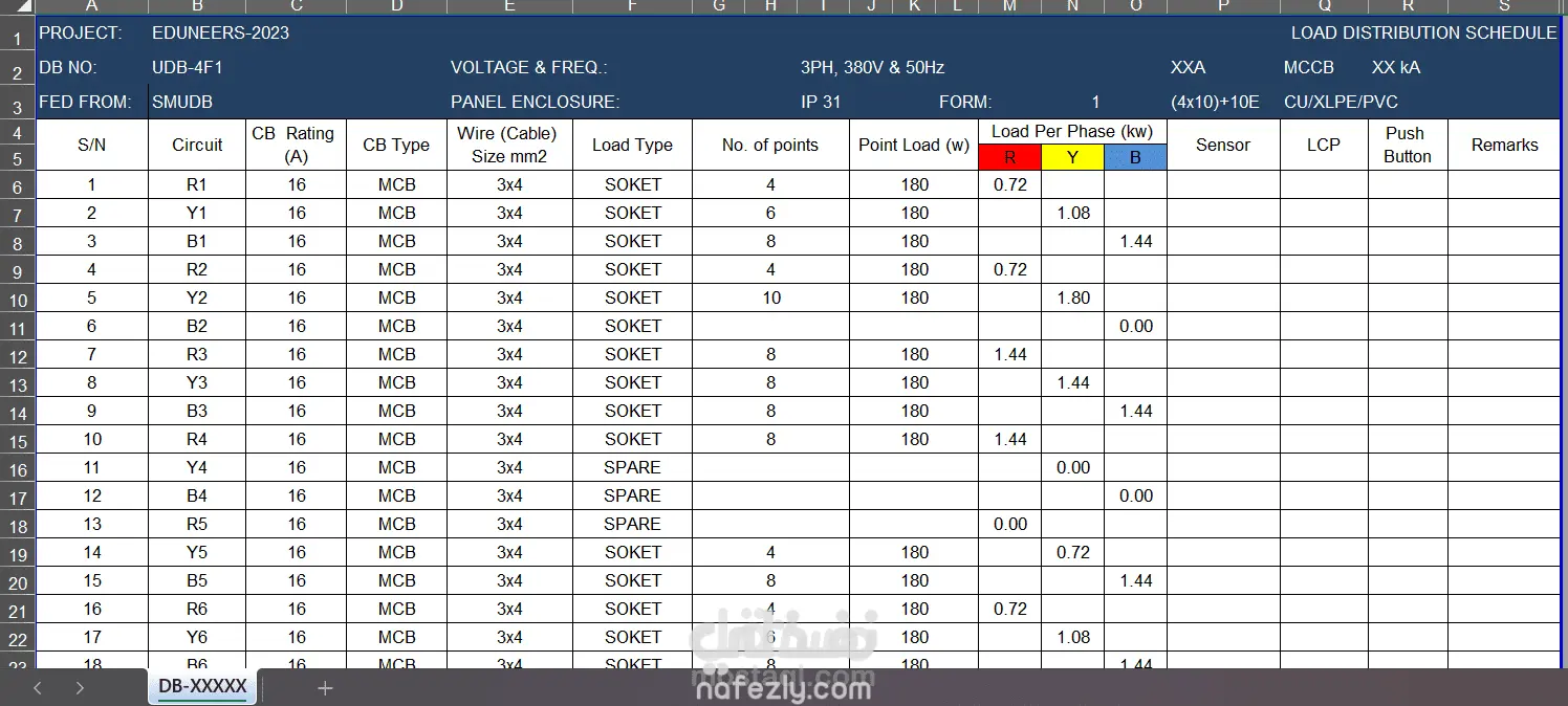 تقدير قيمة احمال الاضاءة والطاقه مع وضعها في ملف اكسيل للتسهيل علي المالك والعمال مع تحسين قيمةالتغير بين الثلاث فازات
