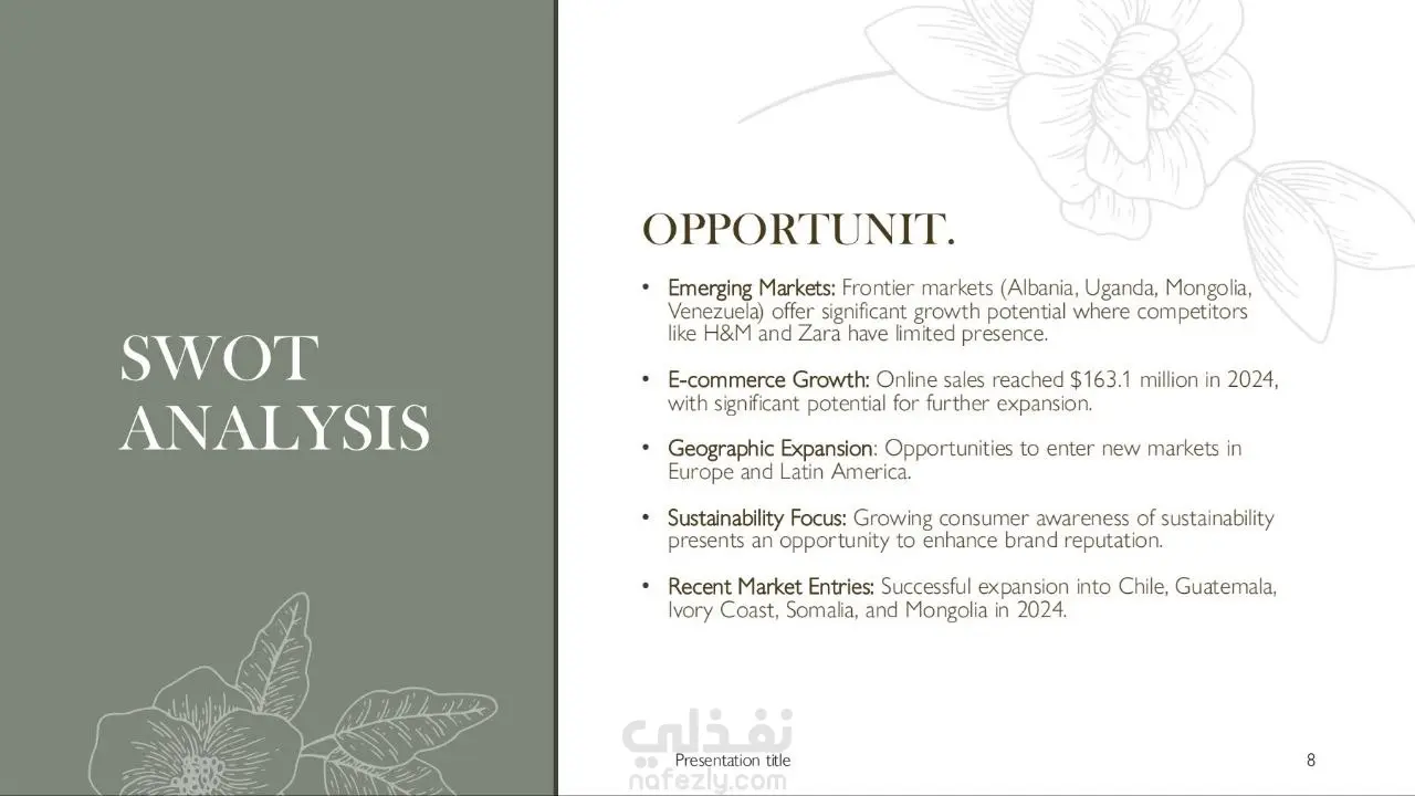 التهديدات: المنافسة الشرسة من ماركات عالمية مثل Zara و H&M و Uniqlo.