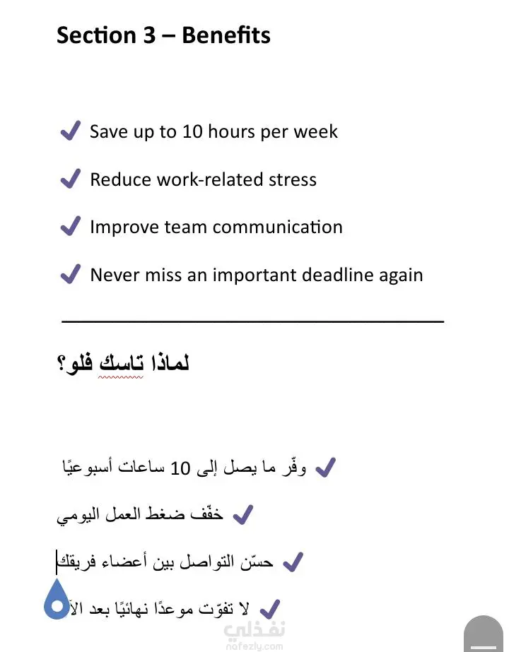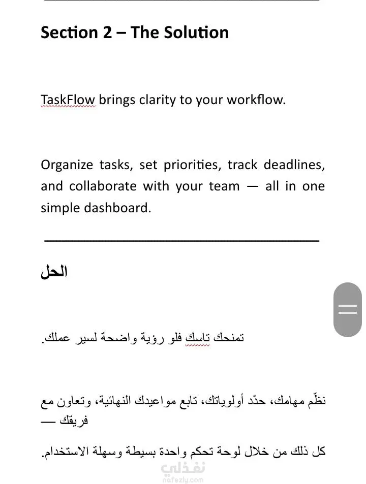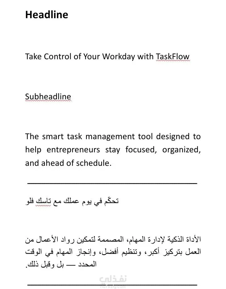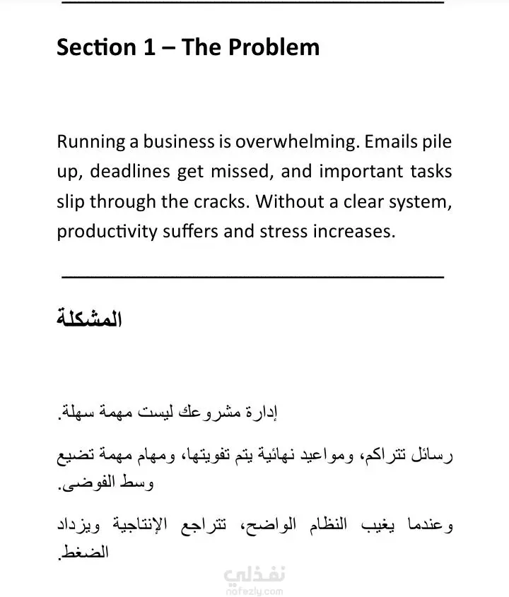 ترجمة صفحة هبوط تسويقية لمنتج SaaS (من الإنجليزية إلى العربية) قمت بترجمة صفحة هبوط تسويقية لمنتج رقمي متخصص في إدارة المهام، موجه لرواد الأعمال وأصحاب المشاريع الصغيرة. ركزت في الترجمة على نقل الرسالة الإقناعية بأسلوب عربي حديث وواضح، مع الحفاظ على قوة العناوين، وتحويل المزايا إلى فوائد ملموسة تناسب الجمهور العربي. شمل العمل: ترجمة العنوان الرئيسي والعنوان الفرعي إعادة صياغة قسم المشكلة والحل بأسلوب تسويقي صياغة الفوائد بشكل مباشر ومقنع ضبط الدعوة لاتخاذ إجراء (CTA) لتكون واضحة وجذابة النتيجة: صفحة عربية متكاملة جاهزة للنشر، تحافظ على الطابع التسويقي دون مبالغة أو ترجمة حرفية.