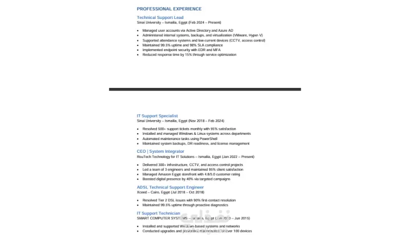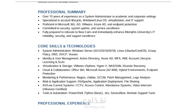 قمت بإنشاء سيرة ذاتية احترافية لمسؤول أنظمة (System Administrator) بخبرة تزيد عن 10 سنوات في إدارة البنية التحتية، أنظمة Windows / Linux، الافتراضية، وأمن المعلومات.