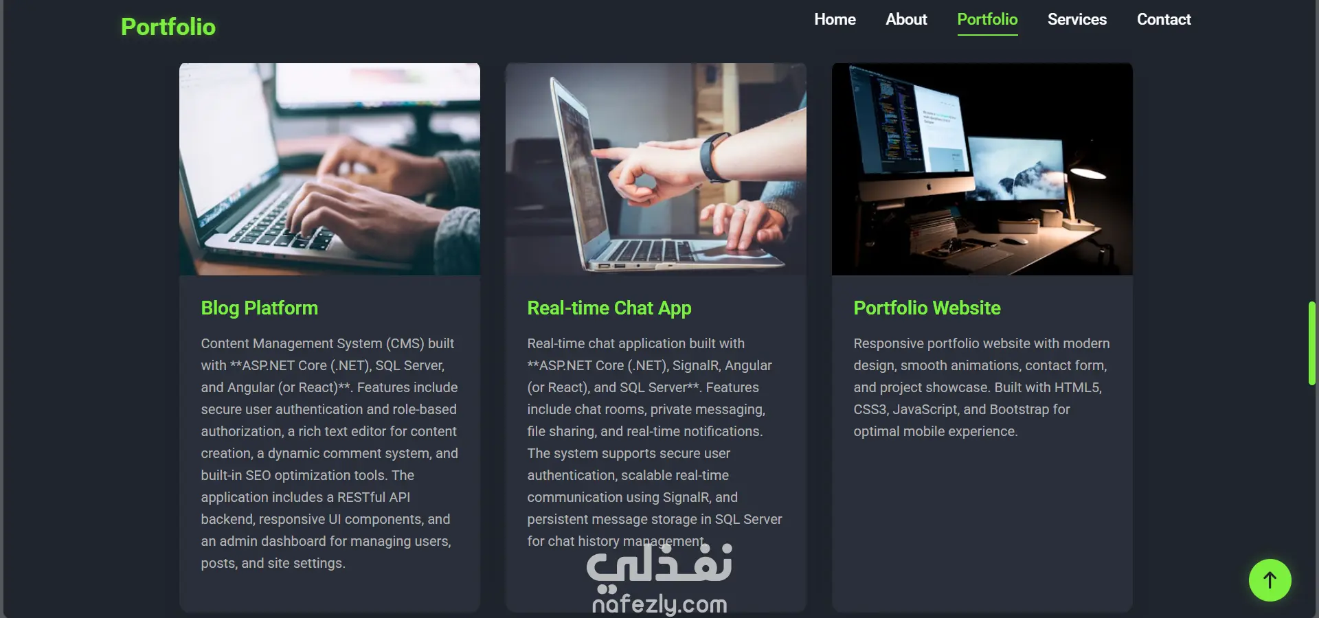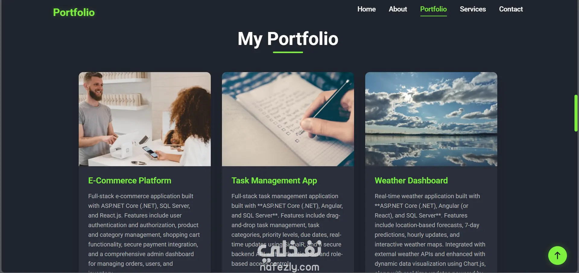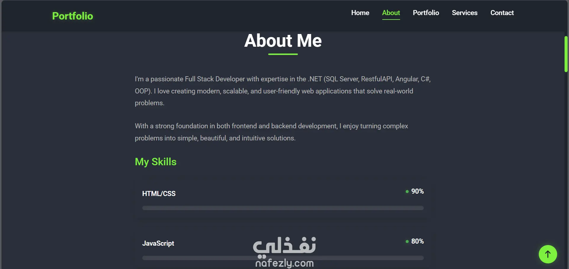 هذا المشروع عبارة عن موقع ويب عصري ومتجاوب بالكامل، مصمم لعرض مهاراتي وخبراتي كمطور تطبيقات متكاملة متخصص في تقنيات .NET. يتميز الموقع بواجهة أنيقة ذات طابع داكن مع لمسات خضراء، ورسوم متحركة سلسة، وتجربة مستخدم سهلة وبديهية.