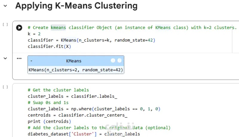 استخدام موديل KMeans لتصنيف مرضى السكر ، باستخدام مكتبات البايثون ، وتجهيز قاعدة البيانات ، وتدريب الموديل واختباره ، واخيرا عمل النظام التنبؤي