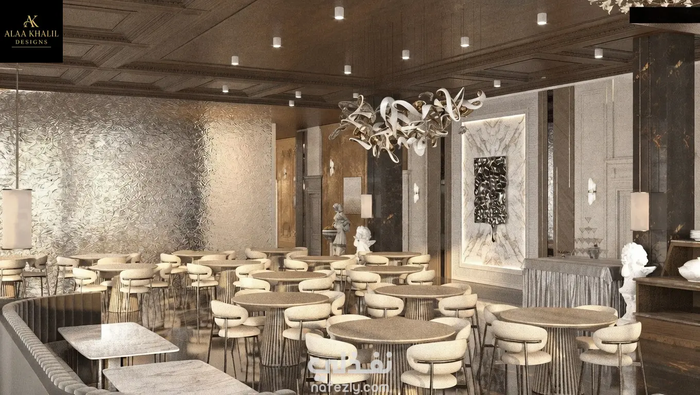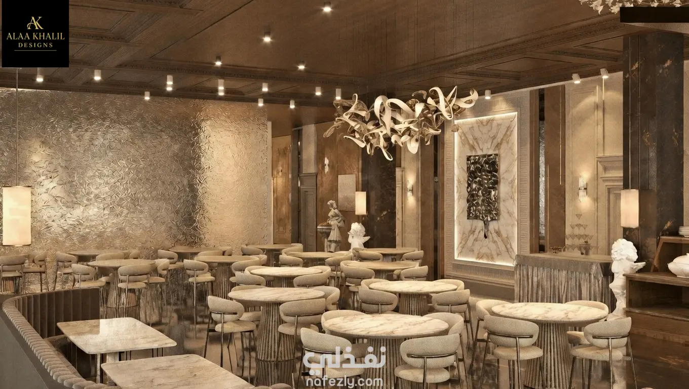 مطعم فاخر ب فندق بأسلوب كلاسيكي حديث مع لمسات عصرية فخمة. الأجواء العامة: دافئة جداً، فاخرة، مريحة وجذابة بصرياً الإضاءة: إضاءة نهارية ناعمة ودافئة (warm white ~2700–3000K). سبوتات (spotlights) مدمجة في السقف، موزعة بشكل متوازن واحترافي جداً (غير عشوائية)، تضيء الجدران والطاولات والعناصر الزخرفية بشكل دقيق وجميل. إضاءة خلفية (backlighting) خفيفة خلف بعض الجدران المزخرفة لإبراز النقوش والملمس. الثريا الرئيسية (التصميم العضوي المعدني الذهبي/البرونزي المعقد الشكل) مضاءة بشكل بارز وتصبح نقطة الجذب الرئيسية في المكان. الجدران: مزيج من التشطيبات الفاخرة: جدران مغطاة بطبقة معدنية لامعة/مطفية بنقوش نباتية ناعمة (موجية أو أوراق ذهبية دقيقة). أجزاء من الرخام أو الحجر الطبيعي بلون كريمي-بيج-ذهبي. لوحة جدارية فنية سوداء بارزة (abstract organic) كعنصر درامي. الأرضية: رخام بألوان دافئة (بيج، كريم، لمسات ذهبية خفيفة) مع نمط دائري أو هندسي ناعم في المنتصف. الأثاث: طاولات دائرية صغيرة ومتوسطة بأسطح رخامية أو خشبية فاتحة. كراسي بتصميم عصري مريح، مقاعد مبطنة بقماش فاخر بلون بيج/كريم/رمادي فاتح. مقاعد طويلة (banquette) منحنية محاطة بجدار خلفي مبطن بنفس اللون الدافئ. العناصر الزخرفية: تمثال ملاك صغير (cherub) كلاسيكي على طاولة جانبية. إناءات وأواني بيضاء فاخرة كديكور. لوحات فنية وإكسسوارات معدنية ذهبية/برونزية. السقف: خشبي/مُزخرف بتفاصيل كلاسيكية دقيقة (ممكن كاسيتون أو نقوش هندسية)، مع إضاءة مدمجة تجعله يبدو مرتفعاً وفسيحاً. الانطباع الكلي: المكان يعطي شعوراً بالرفاهية الهادئة والأناقة الخالدة، مزيج مثالي بين الكلاسيكية الأوروبية الفاخرة والحداثة الناعمة. الإضاءة الدافئة والسبوتات المنتشرة بشكل مدروس تجعل كل زاوية تبدو مصورة بشكل احترافي، وكأنها جاهزة لصور "golden hour" داخلية.