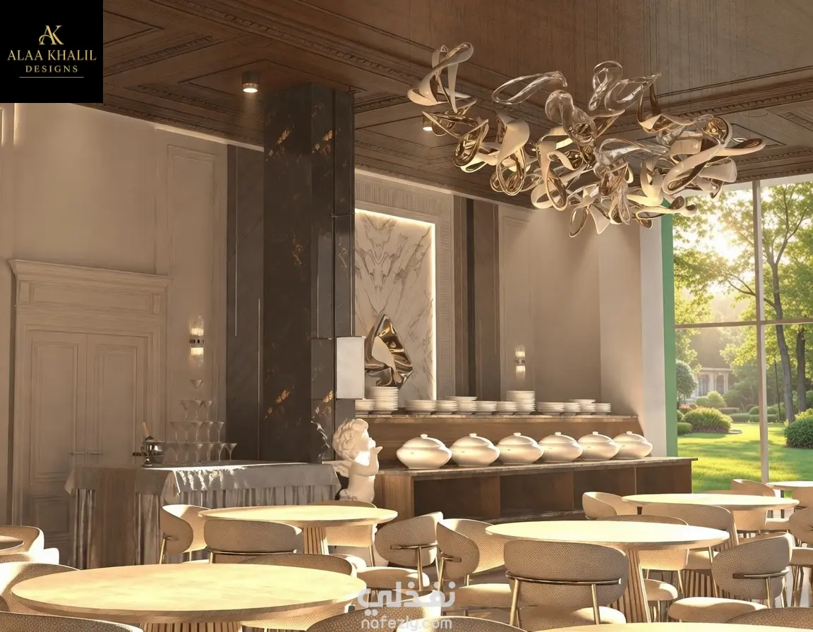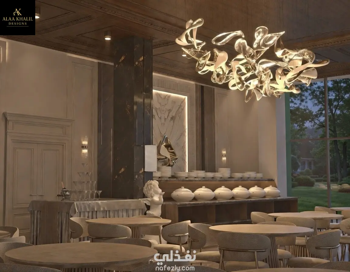 مطعم فاخر ب فندق بأسلوب كلاسيكي حديث مع لمسات عصرية فخمة.