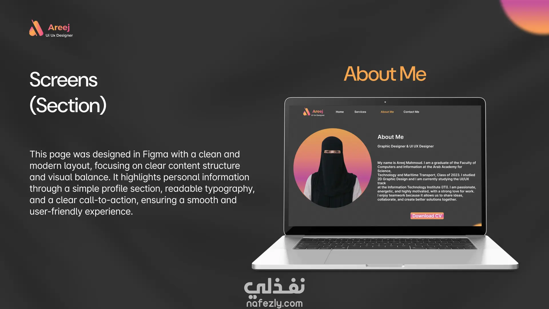 انا أريج محمود مصممة واجهات المستخدم ui ux Designer ولدى خبرة فى مجال التصميم قمت بتنفيذ بورتفوليو شخصي البرامج المستخدمة لأنجاز الخدمة 1- فيجما 2- أدوبي فوتوشوب ماذا ستحصل عليه؟ -تصميم واجهة عصرية وجذابة (UI حديث) -تنظيم احترافي للمحتوى يعكس خبراتك ومهاراتك -تصميم متوافق مع جميع الأجهزة (Responsive Design) -اختيار ألوان وخطوط متناسقة تعبر عن هويتك -نموذج تفاعلي (Prototype) لعرض طريقة التنقل بين الصفحات -تسليم ملف Figma منظم وجاهز للتطوير