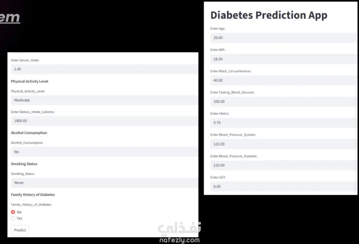 قمت بتطوير نموذج ذكاء اصطناعي يهدف إلى التنبؤ باحتمالية إصابة شخص بمرض السكري اعتمادًا على مجموعة من البيانات الصحية الأساسية. يهدف المشروع إلى المساعدة في الاكتشاف المبكر وتقليل المخاطر من خلال تحليل البيانات واتخاذ قرار تنبؤي مدعوم إحصائياً. فكرة المشروع يعتمد النظام على إدخال مجموعة من المؤشرات الصحية يقوم النموذج بتحليل هذه البيانات وإعطاء نتيجة توضح احتمالية الإصابة (مرتفع / منخفض) بناءً على الأنماط المستخلصة من البيانات. التقنيات المستخدمة تحليل البيانات ومعالجتها (Data Cleaning & Preprocessing) بناء نموذج تصنيف باستخدام خوارزيات تعلم الآلة تدريب النموذج واختباره وقياس الأداء (Accuracy – Precision – Recall) تحسين الأداء عبر ضبط المعاملات (Hyperparameter Tuning) النتائج تم تحقيق دقة تنبؤ جيدة، مع قدرة النموذج على التمييز بين الحالات المعرضة للخطر وغير المعرضة بدرجة موثوقة، مما يجعله أداة مساعدة في الفحص المبدئي. قيمة المشروع يوضح القدرة على تحويل البيانات الصحية إلى نموذج تنبؤي عملي يعكس مهارات في تحليل البيانات وبناء النماذج قابل للتطوير ليصبح تطبيق ويب أو نظام دعم قرار للعيادات