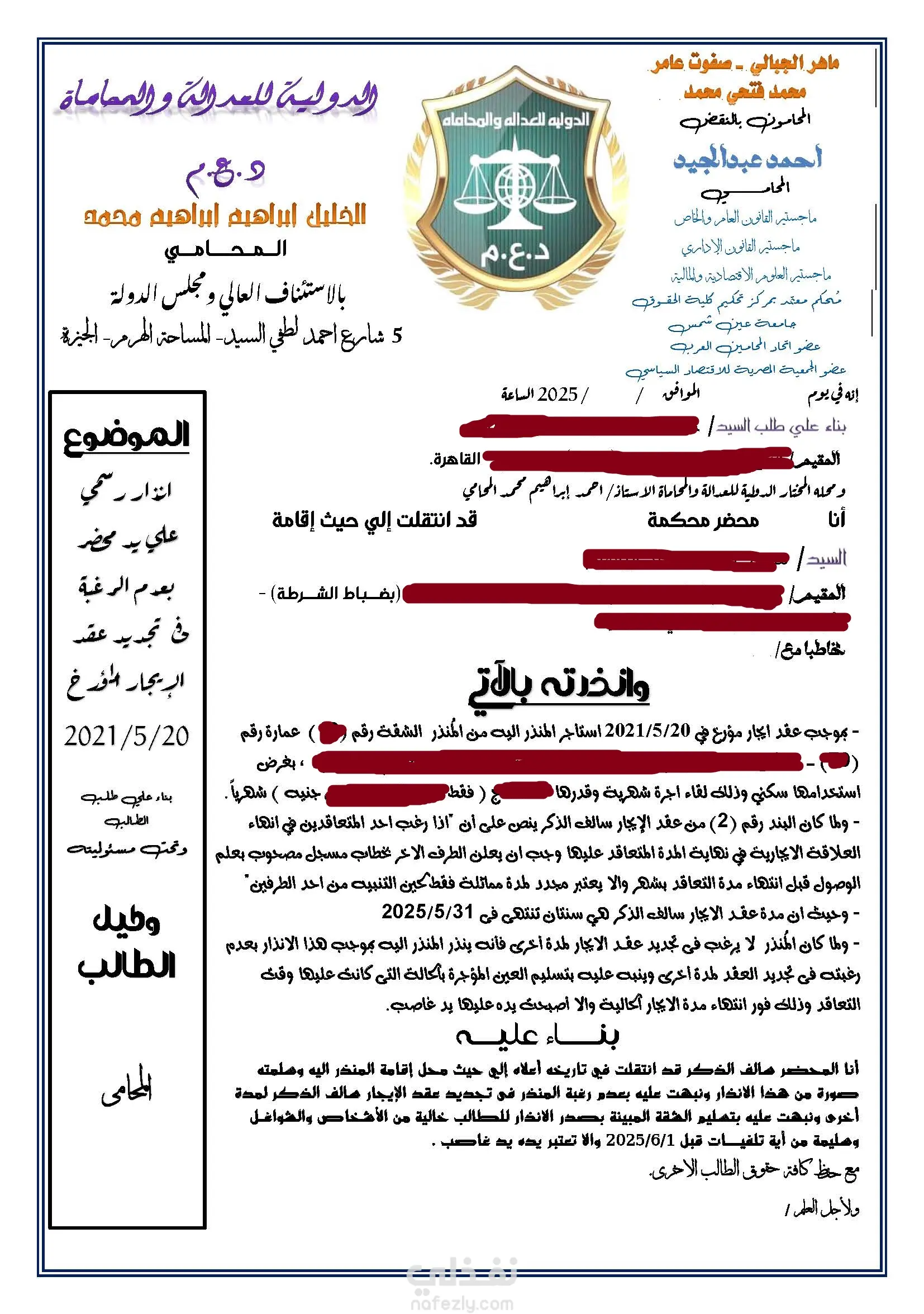انذار رسمي علي يد محضر بالتنبيه عليه بعدم الرغبة في تجديد عقد الايجار